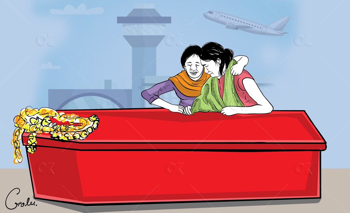 कोरोना लागेर निको भइसकेँ, दशैंमा घर आउँछु’ भनेर फोन गरेका गणेशले मलेसियाकै अस्पतालमा प्राण त्याग्नुपर्यो । कोरोनाबाट मृत्यु भएकाले शव ल्याउन नमिलेपछि उतै जलाउन सहमति दिन राधालाई कर लाग्यो । शनिबार विदेशबाट ६ शव र १५ वटा अस्तु आइपुगेका थिए ।महामारीमा अहिले दैनिक औसतमा तीनजना नेपाली श्रमिकका शव र त्यसको दोब्बर अस्तु आइरहेका छन् । जीवन सुधार्ने सपना लिएर विदेश उडेका युवामध्ये कोही बाकसमा सिंगै त कोहीको अस्तु मात्र फर्किरहँदा सरकार भने यो अवस्थाप्रति संवेदनशील बनिरहेको छैन ।उमेरले ७० काटेकी नुवाकोटकी कोइकु घलेले पनि ‘दुई वर्षमा आउँछु है आमा’ भन्दै कुवेत उडेकी छोरीलाई काठको बाकसमा बुझ्नु पर्यो । सोनुलाई कुवेत पुगेको चार महिनामा ब्लड क्यान्सर भएको थाहा भयो । त्यसको एक हप्तामै उनले संसार छाडिन् । यो तथ्य पत्याउन परिवारलाई अझै सकस परिरहेको छ ।