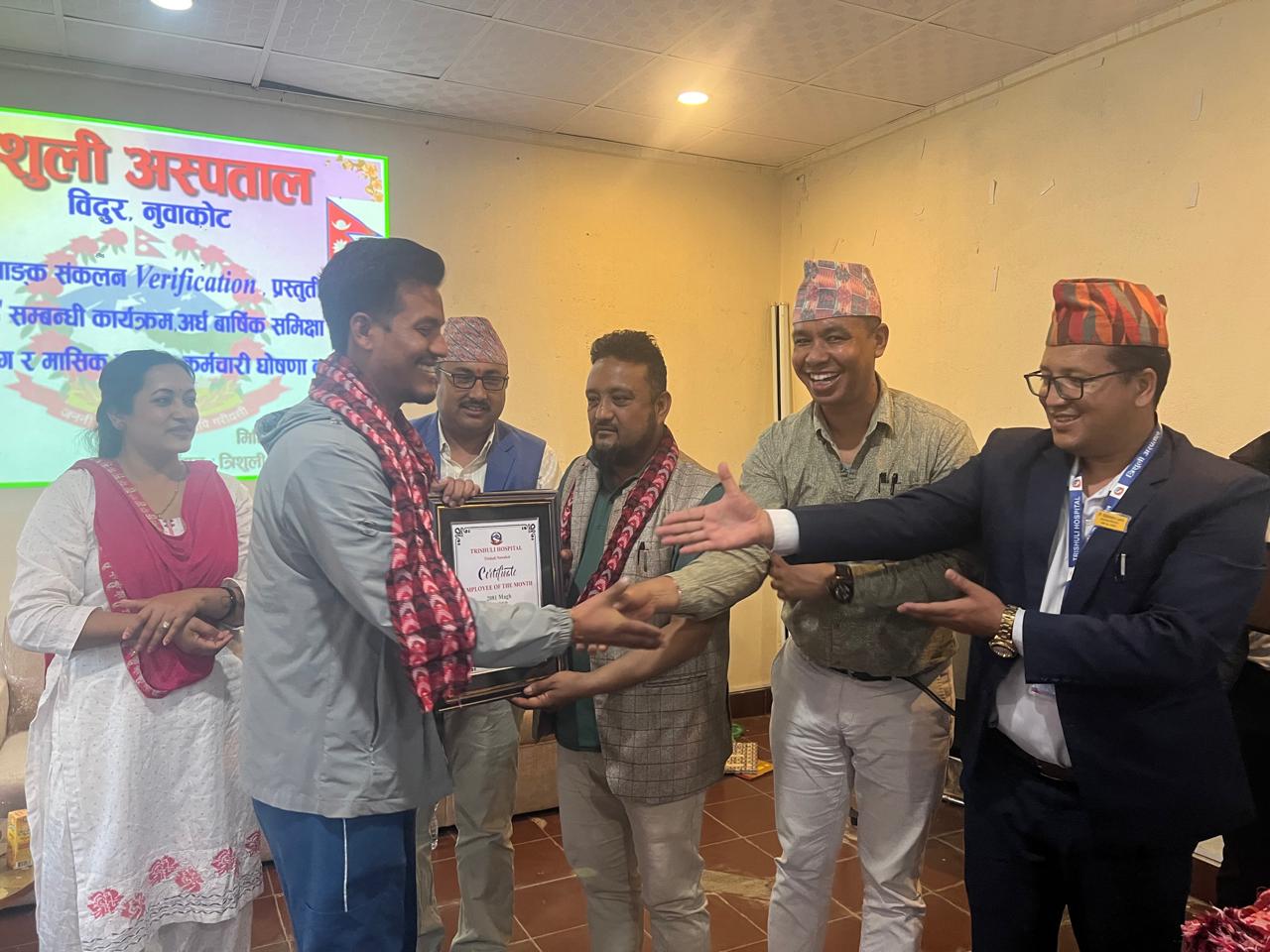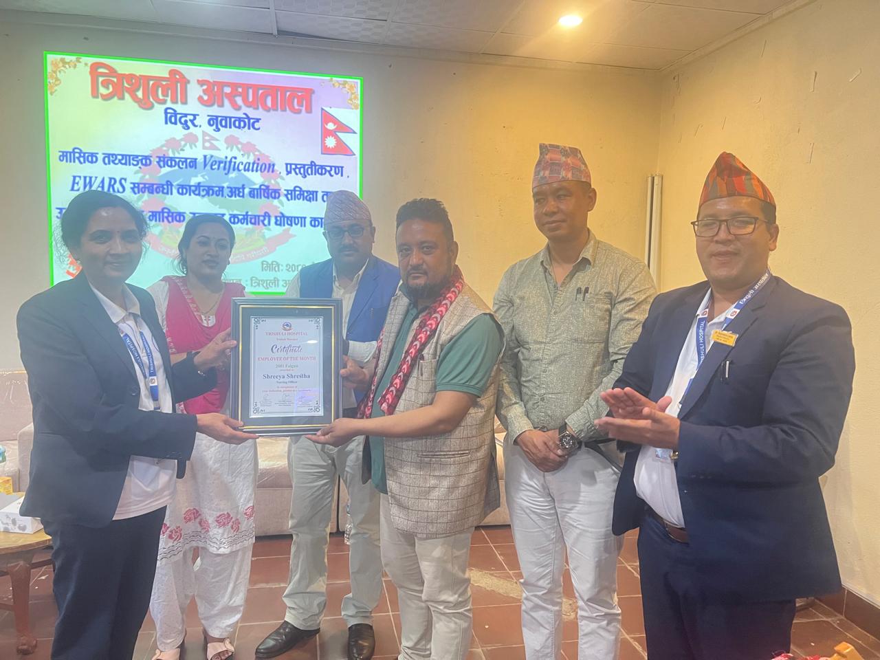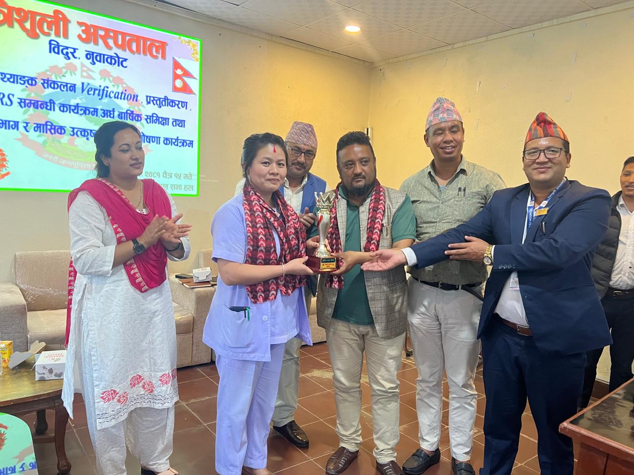 बिदुर नगरपालिका ९ कोलोनीमा रहेको त्रिशूली अस्पतालले कार्यक्रमका वीच एक चिकित्सकसहित दुई स्वास्थ्यकर्मी र शाखातर्फ जनरल वार्डलाई पुरस्कृत गरेको हो । अस्पतालमा आयोजित कार्यक्रममा प्रमुख अतिथी विदुर नपा ४ का वडाध्यक्ष नीलमवावु ढुंगेलले अस्पतालका डा. मनोज महर्जन र स्टाफ नर्स श्रेया श्रेष्ठलाई नगद जनही पांच÷पांच हजार रुपैया तथा उत्कृष्ट विभागतर्फ छनौट भएको जनरल वार्डलाई नगद दुई हजार रुपैयाका साथ प्रमाण पत्र प्रदान गरेर पुरस्कृत गरे ।