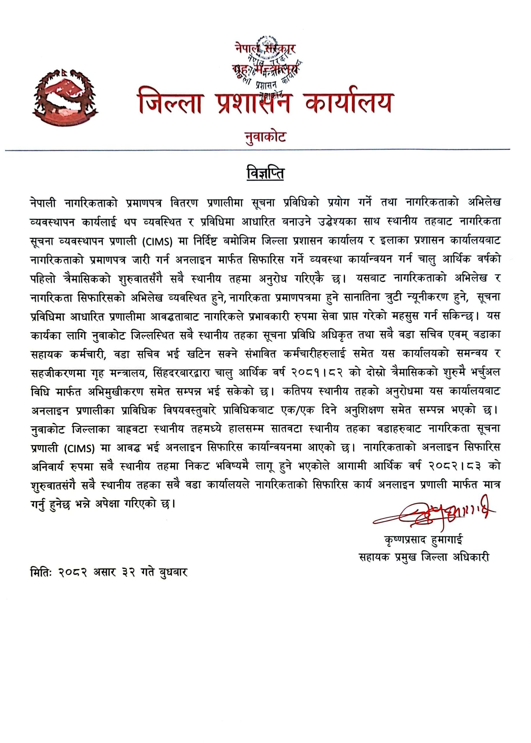 गृह मन्त्रालयले प्रयोगमा ल्याएको नागरिकताको केन्द्रीकृत सूचना प्रणालीमार्फत अनलाइन सिफारिसलाई पूर्णरुपमा निकट भविष्यमै लागू गरिने नुवाकोट प्रशासनको तयारी छ । यसलाई अनिवार्य गरिसकेपछि अनलाइन प्रणाली बाहेक सिफारिस भई आएका नागरिकता नुवाकोट प्रशासन जारी गर्न वाध्य नहुने जनाएको छ ।
