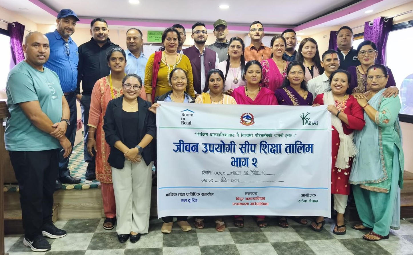 विदुर नगरपालिकाको समन्वय र रुम टुरिडको आर्थिक तथा प्राविधिक सहयोगमा रुडेक नेपालको आयोजनामा शिक्षकशिक्षिकाहरुका लागि विदुरमा सन्चालित ४ दिने जीवनोपयोगी सीप शिक्षा तालिम सम्पन्न भएको हो । विदुर नपाका सामुदायिक विद्यालयमा जीवनोपयोगी सीप प्रदान गर्ने उद्धेश्यले उक्त कार्यक्रम संचालन गरिएको आयोजक रुडेक नेपालका अध्यक्ष मीनकुमार केसीले जानकारी दिए ।