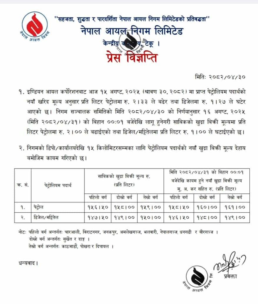 नयाँ मूल्य अनुसार तेस्रो वर्गका लागि पेट्रोल प्रतिलिटर १६१ रुपैयाँ र डिजेल र मट्टितेल प्रतिलिटर १४९ रुपैयाँ रुपैयाँ कायम भएको छ । नेपाल आयाल निगमले प्रत्येक १५/१५ दिनमा पेट्रोलियम पदार्थको मुल्य समायोजन गर्दै आइरहेको छ ।