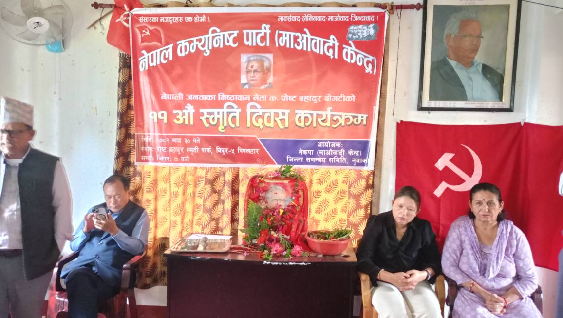 बिदुर- पुर्वमन्त्रि तथा नेकपा (माओवादी केन्द्र)का तत्कालीन उपाध्यक्ष स्व. पोष्टवहादुर वोगटीलाई सोमवार उनको गृहजिल्ला नुवाकोटवासीले सम्झिएका छन् । श्रमजीवि नेताको पहिचान वनाएका स्व. . बोगटी को ११औं स्मृति दिवस नुवाकोटको विभिन्न स्थानमा मनाउंदै उनको योगदान सम्झिइएको छ ।