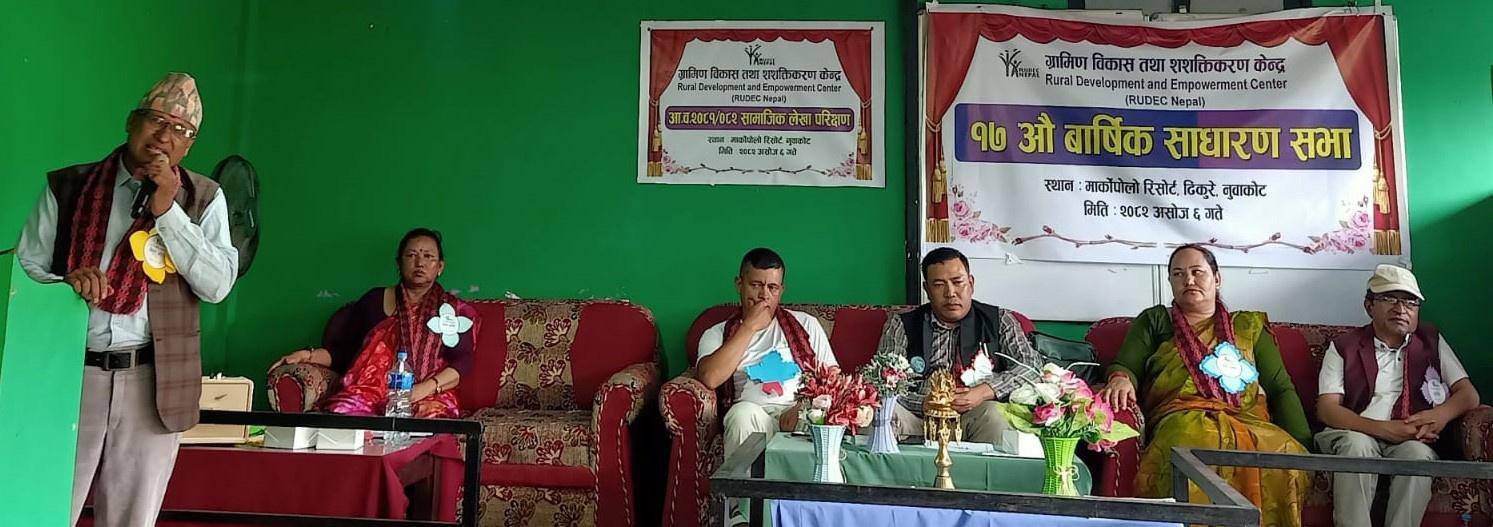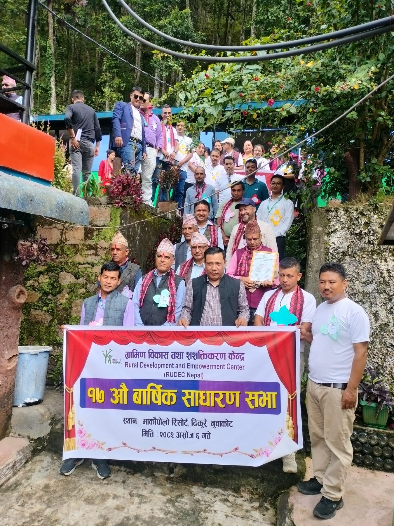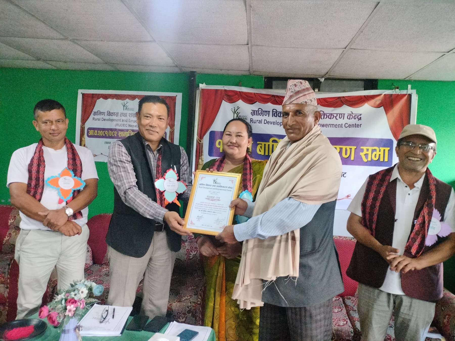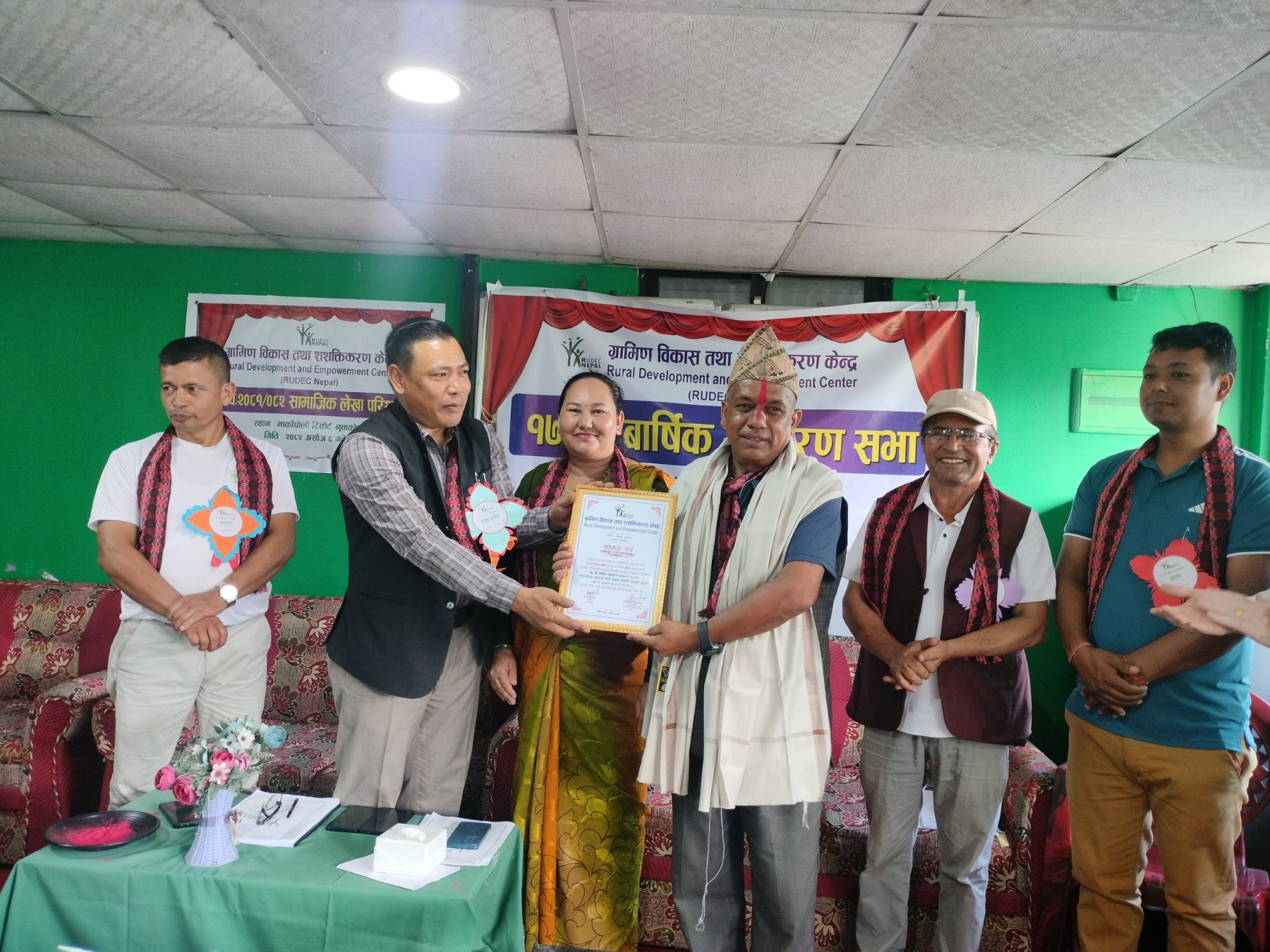 ग्रामीण विकास तथा सशक्तिकरण केन्द्र नेपाल (रुडेक नेपाल)ले आफ्नो १७ औ वार्षिक साधारण सभाको अवसरमा बिद्यालयहरुलाई दोसल्ला ओढाउनुका साथै कदरपत्रद्धारा सम्मान गरेको हो । यसका साथै उत्कृष्ट किसान र संस्थाको उत्कृष्ट कर्मचारीलाई सम्मान र संस्थाको सहयोगमा अध्ययन गरी कक्षा १२ उत्तिर्ण भएका बिद्यार्थीहरुको बिदाई, गरिएको छ ।