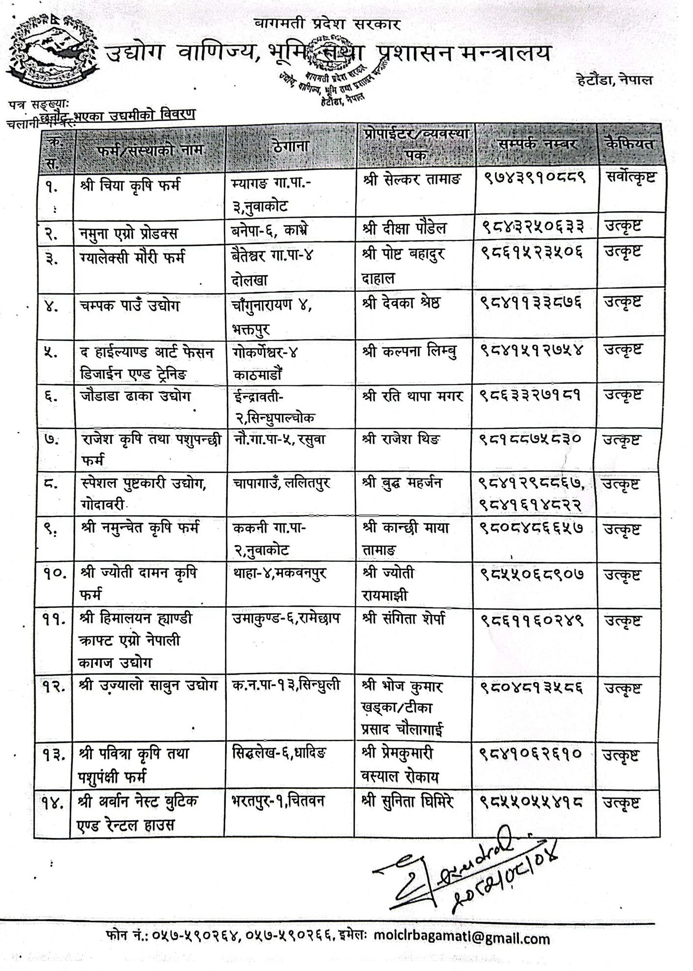 उनको नवप्रवर्तन र उद्यमशीलतालाई वागमति प्रदेश सरकारले विशेष मूल्याङ्कन गरेको हो । यसैगरी, ककनी गाउँपालिका–२ हिलेभित्तामा रहेको नमुन्चेत कृषि फर्मकी प्रोप्राइटर कान्छीमाया तामाङ उत्कृष्ट उद्यमीको रूपमा छनौट भएकी छन् । उनले कृषि क्षेत्रमा पु¥याएको योगदानको प्रशंसनीय गर्दै छनौटमा पर्न सफल भएको छ । उता, छिमेकी रसुवाको नौकुण्ड गापा ५ मा रहेको राजेश कृषि तथा पशुपन्छि फर्मसमेत उत्कृष्टको रुपमा छनौट भएको छ ।