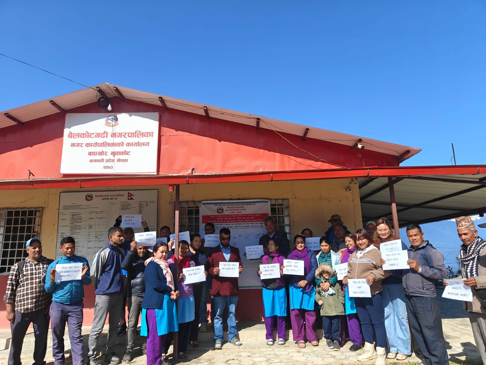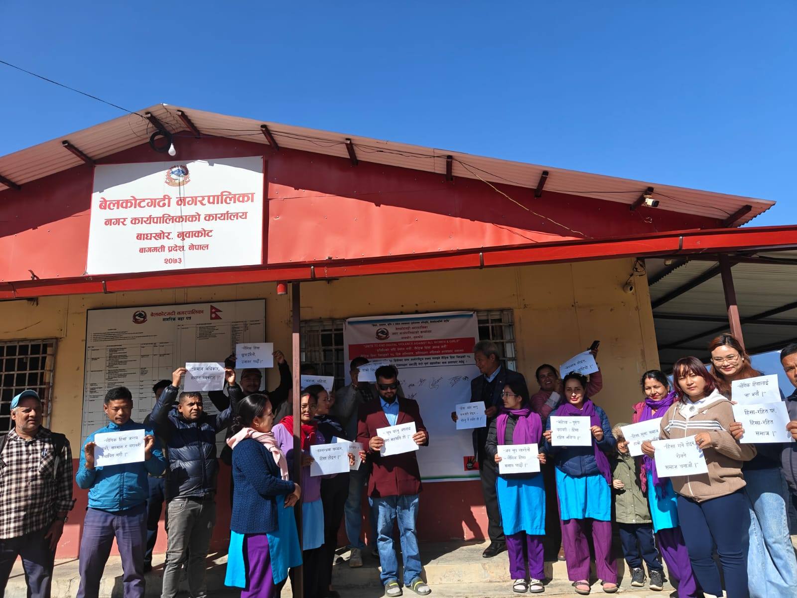 वेलकोटगढी नपा कार्यालय वाघखोरमा हस्ताक्षर संकलन र लैंगिक हिंशा विरुद्धको कार्यक्रमअनर्तगत बेलकोटगढी ७ स्थित महादेबफाटमा जनचेतनामूलक सडक नाटक मन्चन गरिएको छ । सोही कार्यक्रममा नाटकसहित द्विप प्रज्वलनसहित हिंसा गर्ने र सहनु दुबै अपराध हो भन्ने सन्देश प्रदान गरिएको थियो ।