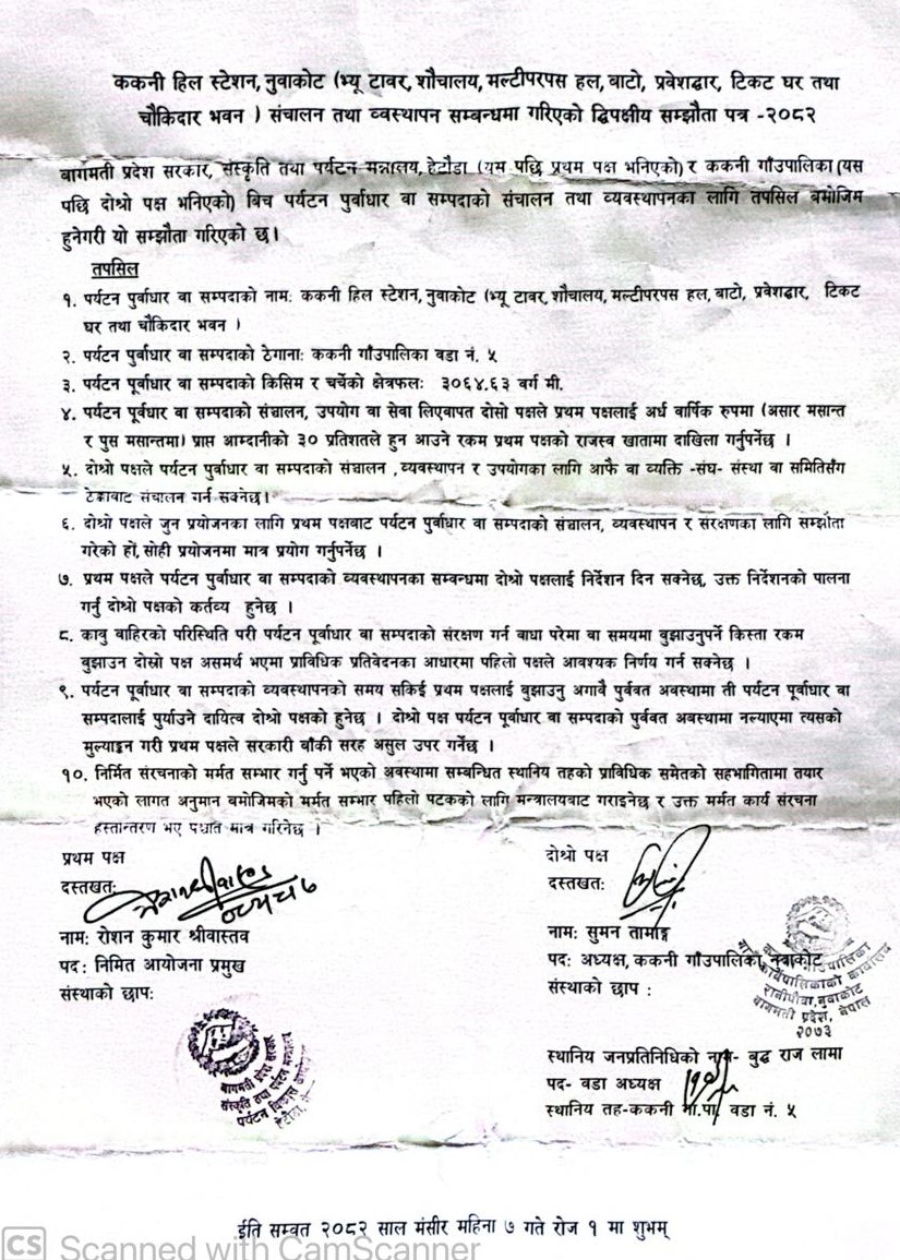 बागमती प्रदेश संस्कृति तथा पर्यटन मन्त्रालयद्वारा कुल ५ करोड ८८ लाख रुपैयाँको लागतमा निर्माण गरिएको भ्यु टावर र बहुउद्देश्यीय कार्यक्रम हल ककनी गाँउपालिकालाई हस्तान्तरण गरिएको छ । बागमती प्रदेशका संस्कृति तथा पर्यटन मन्त्री सुरेश श्रेष्ठले कार्यक्रमकावीच ककनी गापाकी उपाध्यक्ष मिट्ठुमाया तामाङलाई नवनिर्मित भ्यु टावर र बहुउद्देश्यीय कार्यक्रम हल हस्तान्तरण गरे ।