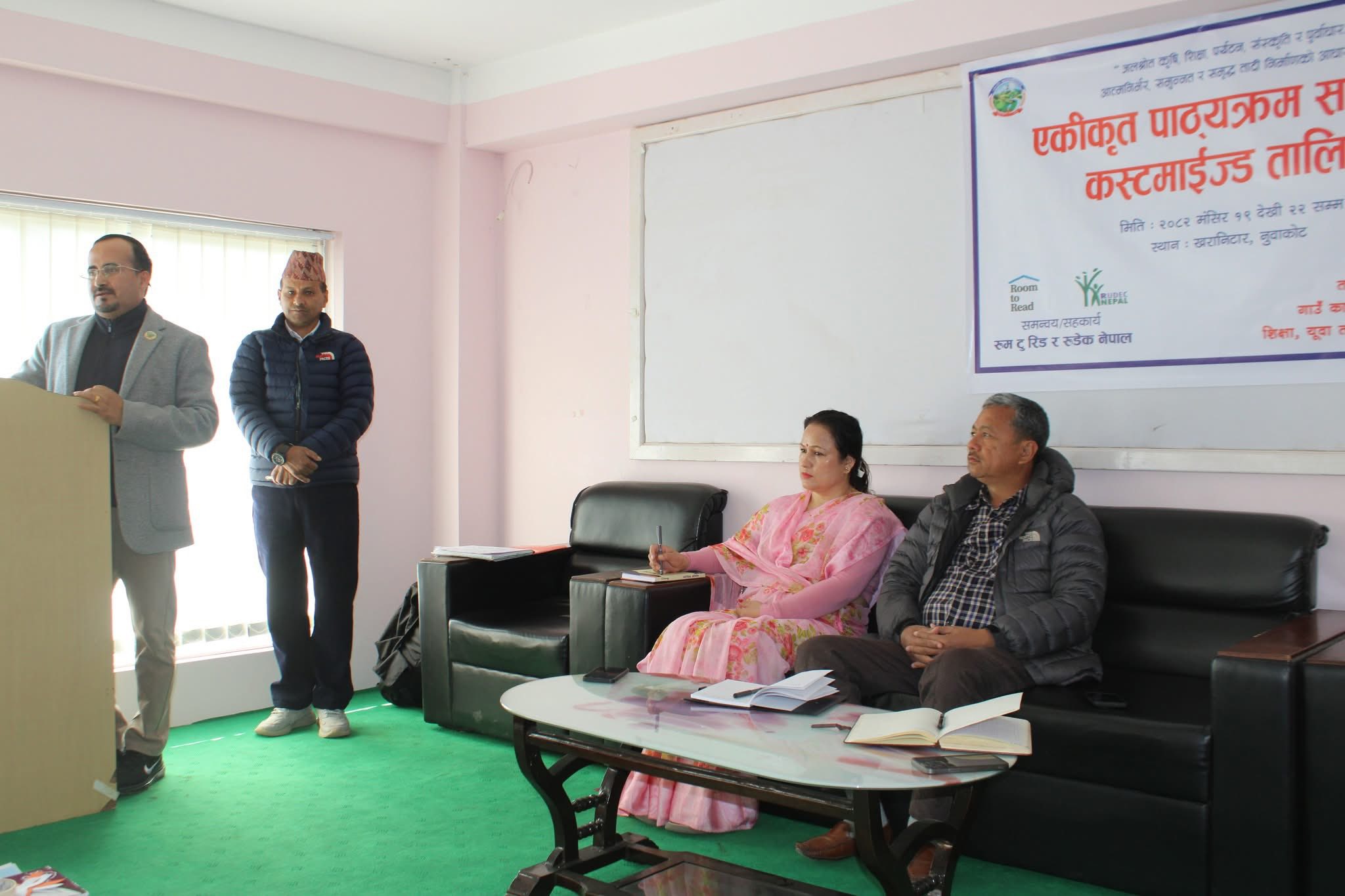 सहभागी शिक्षकहरुलाई रुम टु रिडका कृष्ण खतिवडा, ओमकुमार श्रेष्ठ रुडेक नेपालका सन्तोष खनाल, फुर्कु घलेले सहजीकरण गरिरहेका छन् । सामुदायिक विद्यालयमा प्रारम्भिक कक्षामा संचालित एकीकृत पाठ्यक्रमलाई व्यवस्थित बनाई पाठ्यक्रमको मर्म अनुसार कक्षाकोठा शिक्षणमा सुधार ल्याएर विद्यार्थीको सिकाइलाई प्रवद्र्धन गर्न तालिम संचालन भएको रुडेक नेपालका अध्यक्ष मीनकुमार केसीले जानकारी दिए । दुवै पालिकामा सन्चालित तालिमको उद्घाटन कार्यक्रममा सहभागी अतिथीहरुले शिक्षामा गर्दै आएको सहयोग र समन्वयकारी भुमिकाकोे प्रशंसा गरेका थिए ।