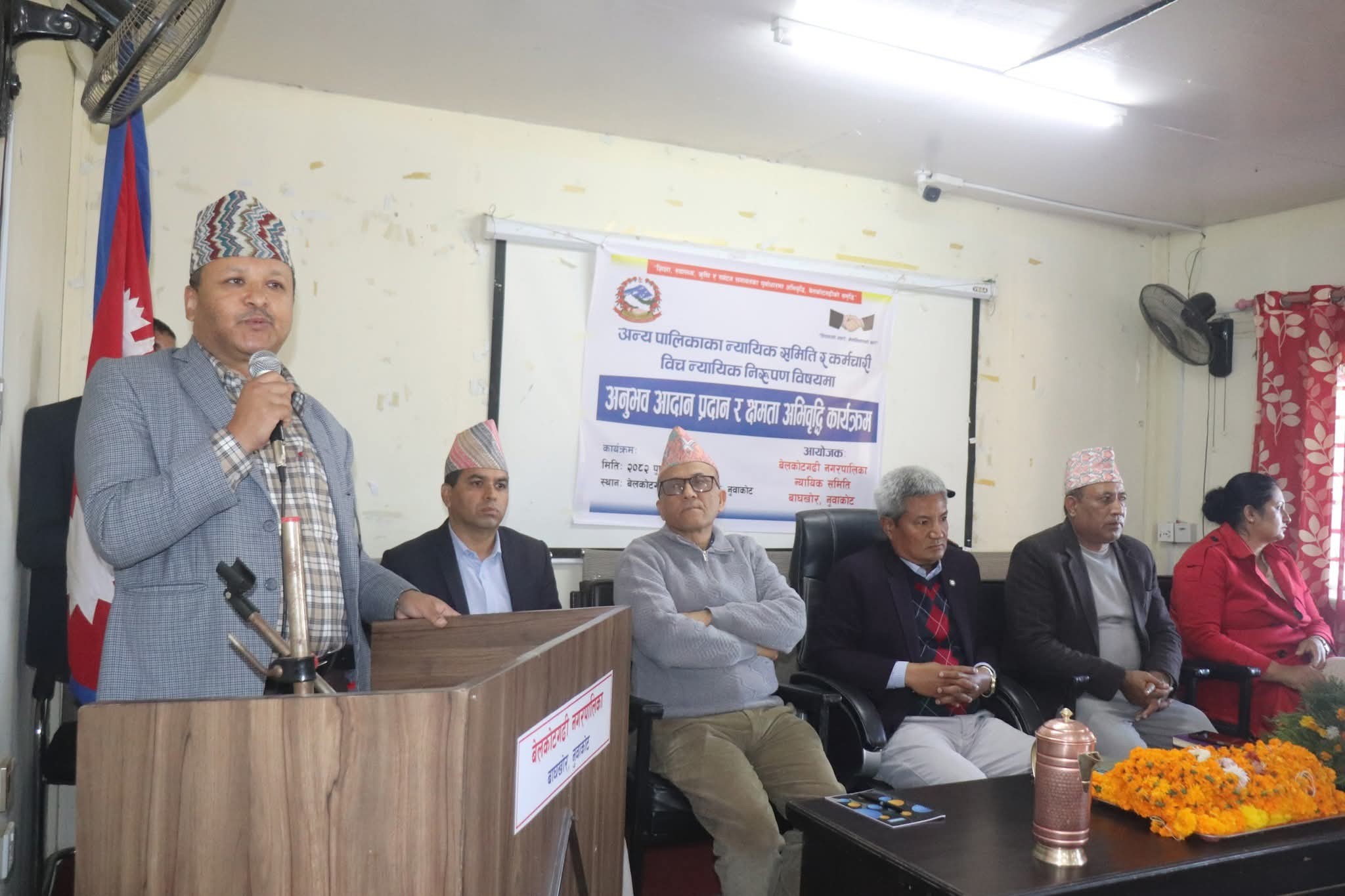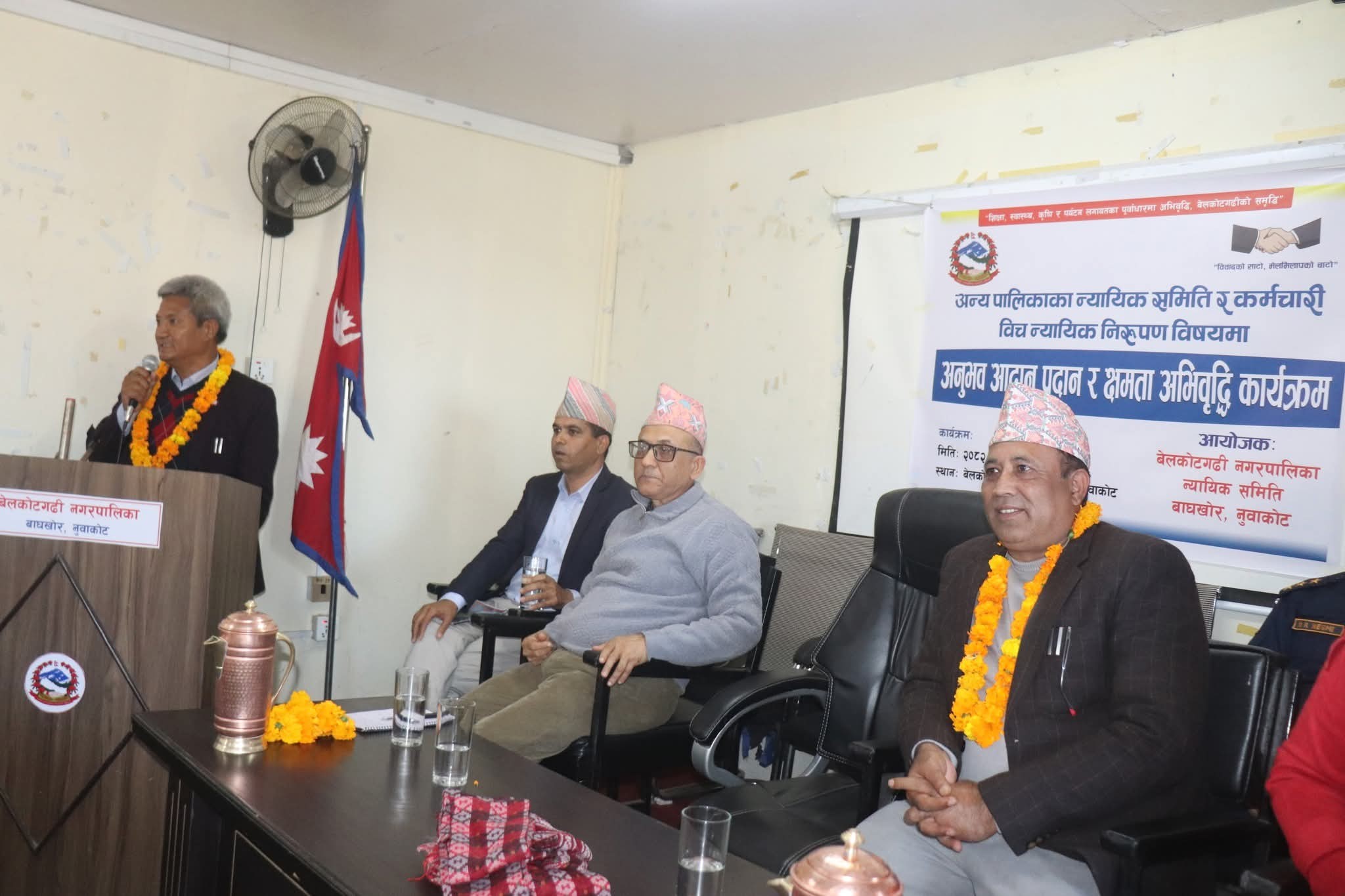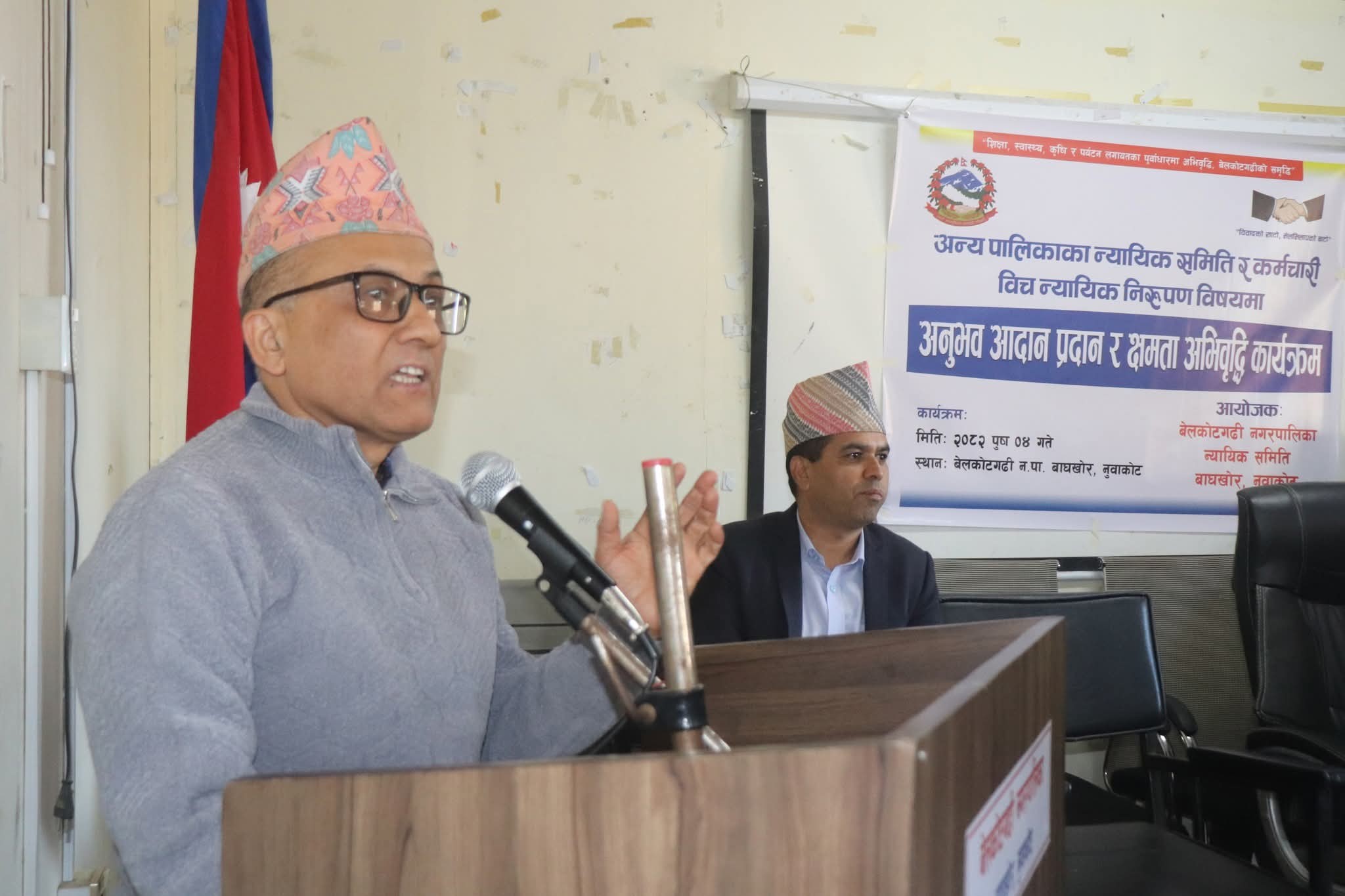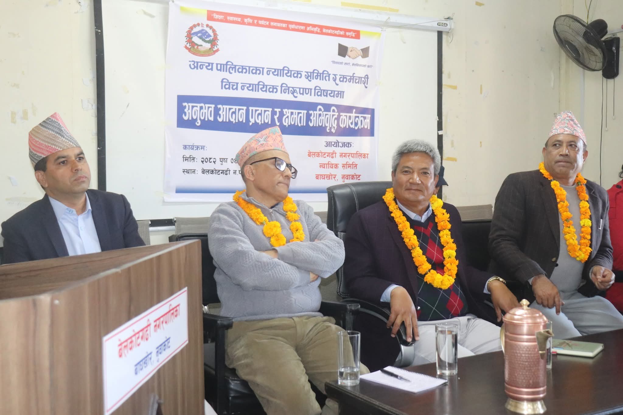 नुवाकोटको बेलकोटगढी नगरपालिका न्यायिक समितिको आयोजनामा नुवाकोटका विभिन्न स्थानीय तहका न्यायिक समिति, सरोकारवाला तथा कर्मचारीबीच शुक्रवार अन्र्तक्रियासहित अनुभव आदान–प्रदान र न्यायिक निरुपणसम्बन्धि क्षमता अभिवृद्धि कार्यक्रम सम्पन्न भएको हो । उक्त कार्यक्रमको उद्घाटन गर्दै बेलकोटगढी नपाका मेयर जगतबहादुर गुरुङले स्थानीयस्तरका समस्या समाधानका लागि न्यायिक समिति क्रियाशील रहेको वताए ।