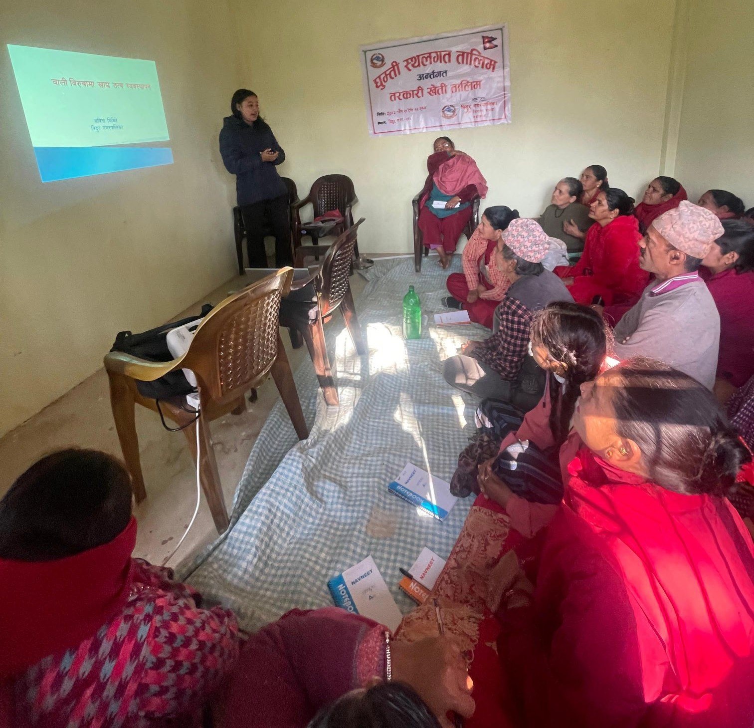 तीन दिनसम्म सन्चालित तालिममा कृषि प्राविधिकहरुले सहभागी किसानहरुलाई सैद्धान्तिक तथा प्रयोगात्मक खेति प्रणालीका सम्वन्धमा जानकारी गराएका थिए । सोही कार्यक्रममा मौसमी र वेमौसमी तरकारी खेति प्रणालीका सम्वन्धमासमेत किसानहरुलाई आवस्यक तालिम प्रदान गरिएको छ ।