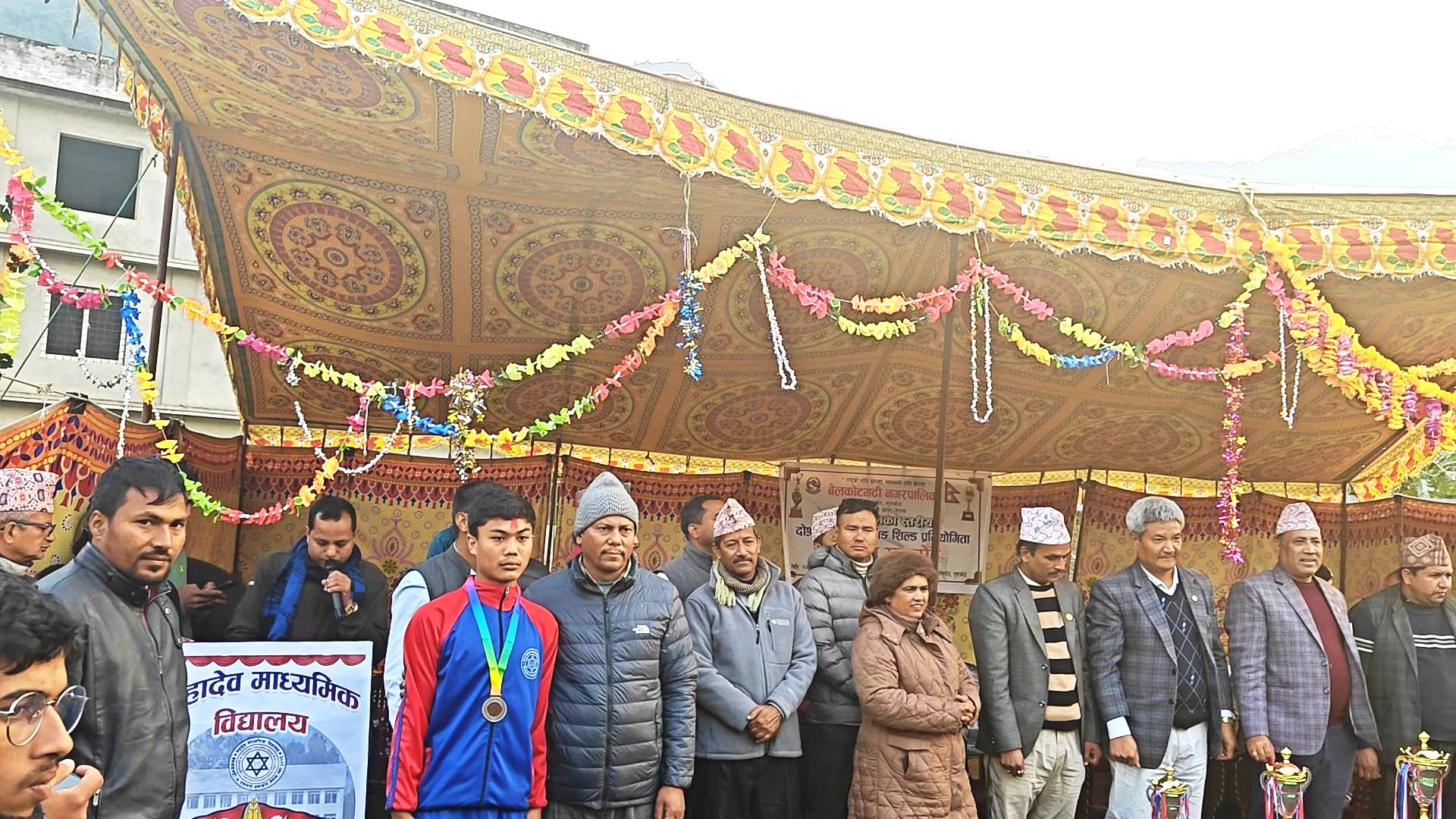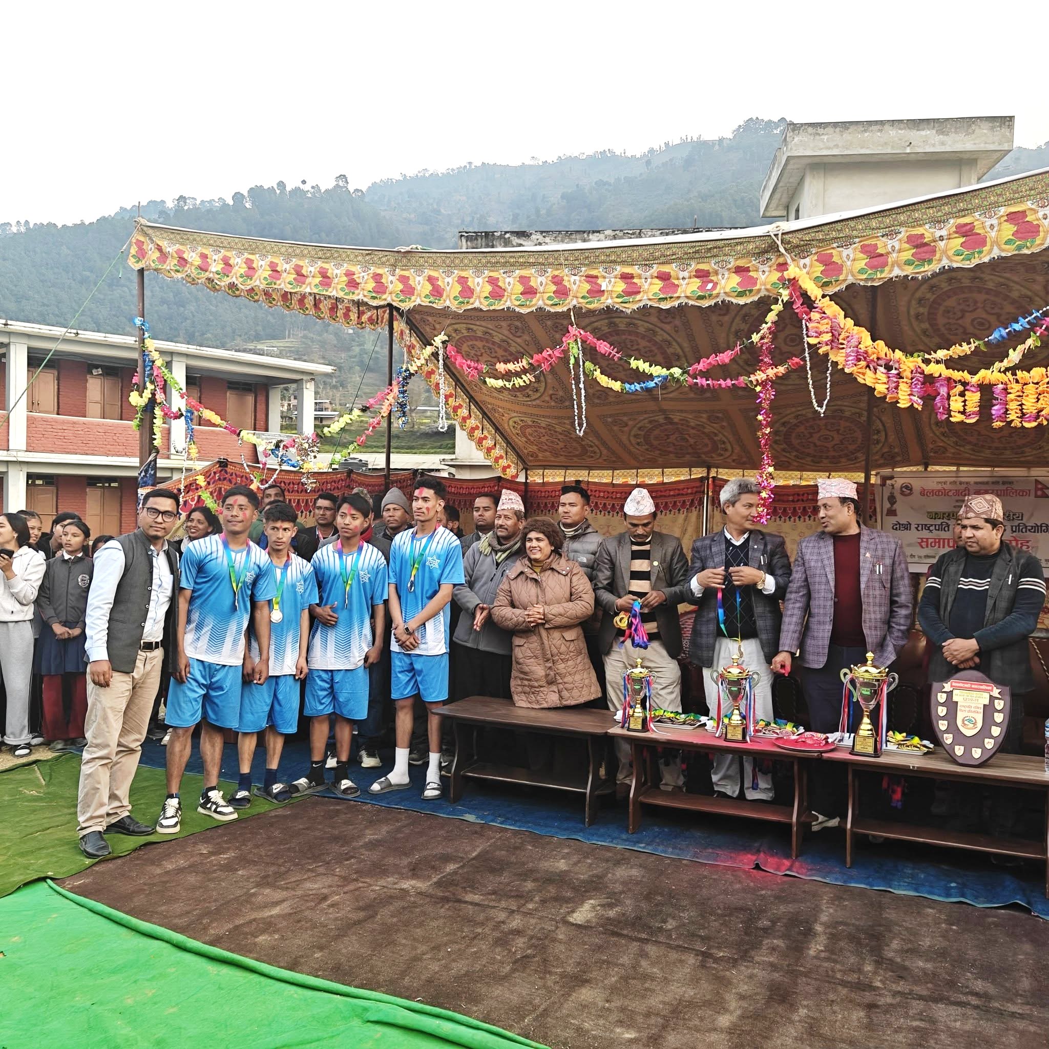 बेलकोटगढी नपाको आयोजनामा महादेवफांटमा सम्पन्न दोस्रो राष्ट्रपति रनिङ शिल्ड खेलकुद प्रतियोगिताको उपाधि घरेलु मैदानमा वेलकोटगढी ७ को महादेव माविले जितेको छ । कार्यक्रमकावीच बेलकोटगढी नपाका मेयर जगतवहादुर गुरुङले पुरस्कार प्रदान गरे ।
