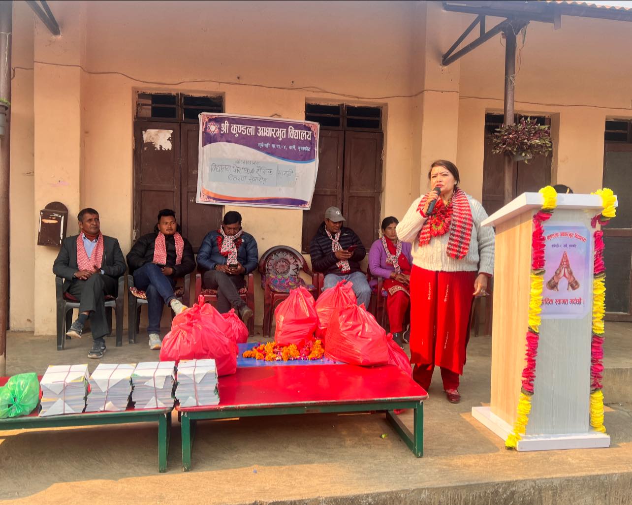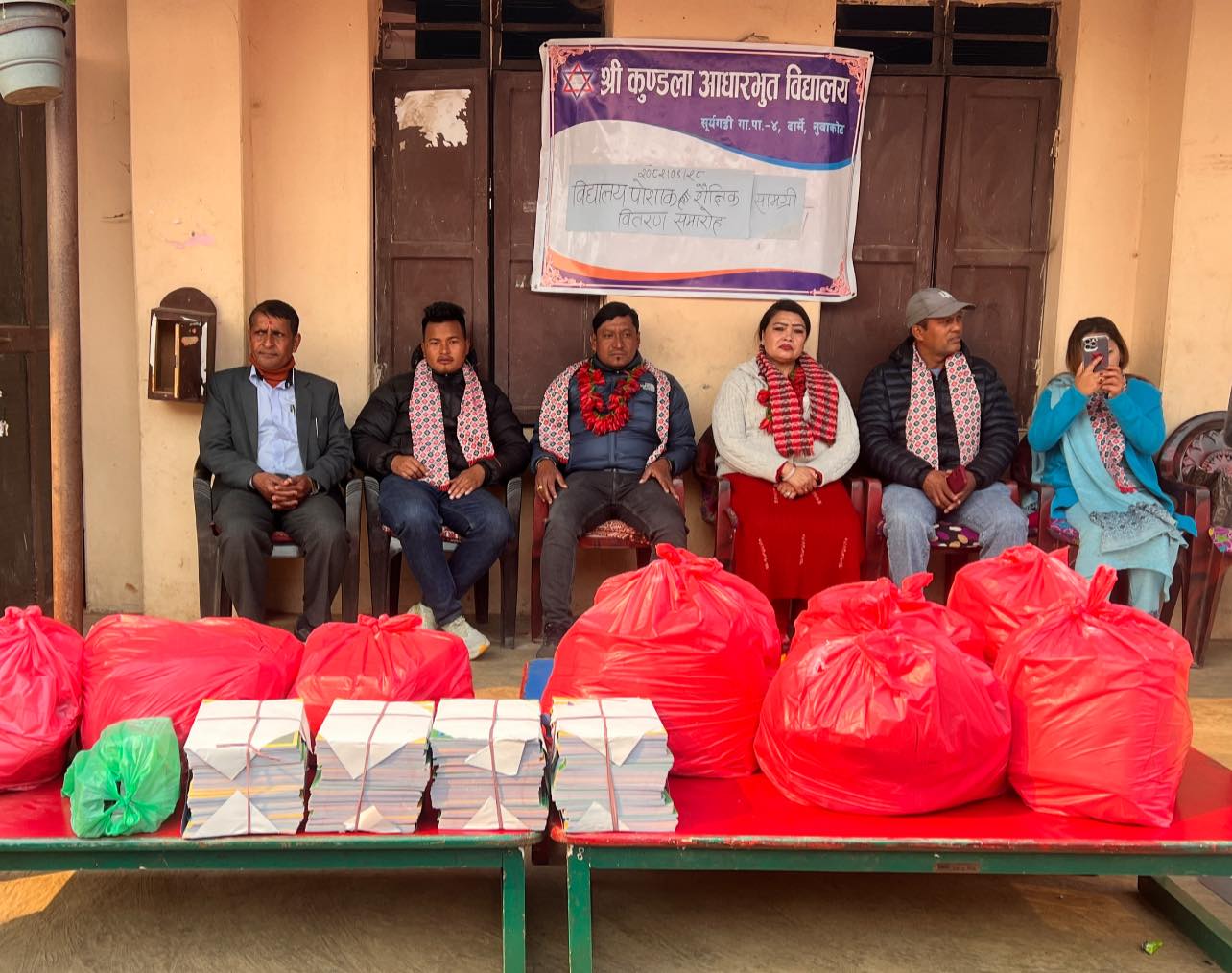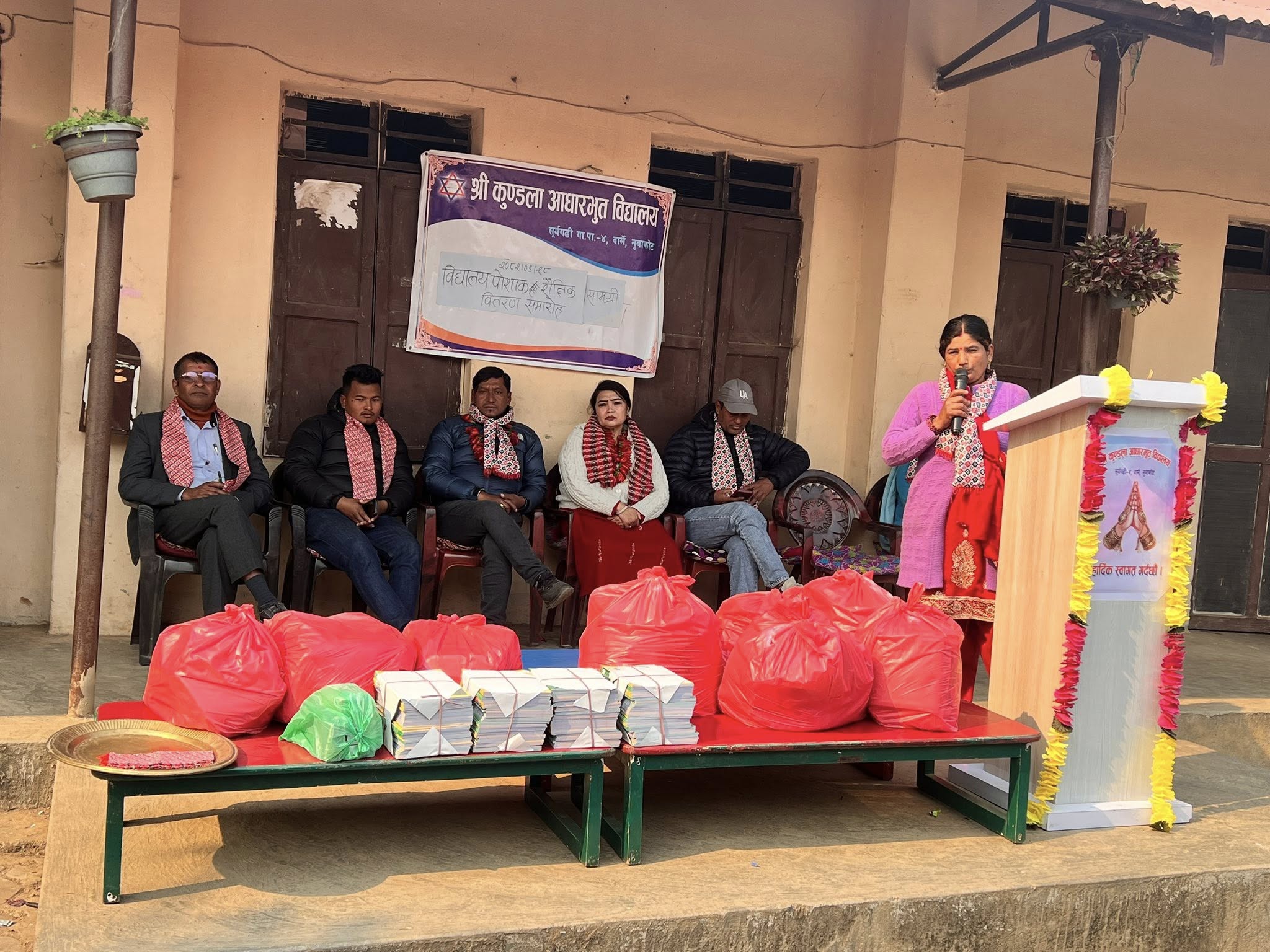 विद्यालयमा पुगेर गापा उपाध्यक्ष मन्जु बुढाथोकीढकाल, वडाध्यक्ष रामशरण राई, विद्यालयमा अध्यक्ष जुनील तामाङ, प्रअ प्रल्हाद भट्टराई, शिक्षक रमेश गिरी, शिक्षाप्रेमीहरुले पोशाक तथा शैक्षिक सामग्रीहरु विद्यार्थीहरुलाई हस्तान्तरण गरेका हुन् । यसवाट विद्यार्थीहरुलाई जाडोयाममा सहजता र सुविधा पुगेको जनाइएको छ ।