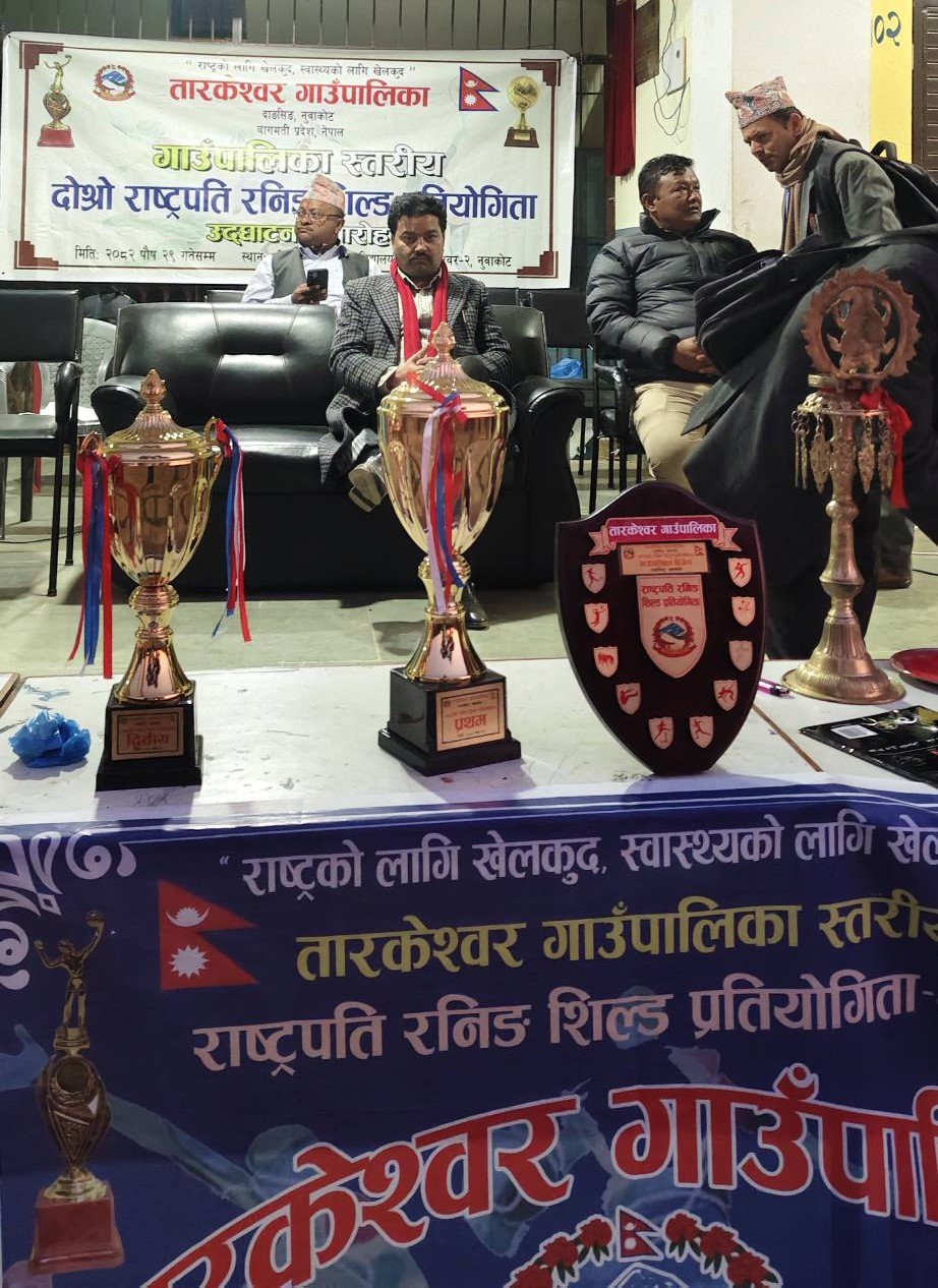 बिदुर– विद्यालयस्तरवाटै खेलकुदको विकास र विस्तार गर्ने उद्धेश्यले नुवाकोटको तारकेश्वर गाउंपालिकामा सन्चालित खेलकुद प्रतियोगिता सम्पन्न भएको छ । तारुकाको आंपचौरमा उक्त प्रतियोगिता सम्पन्न भएको हो ।