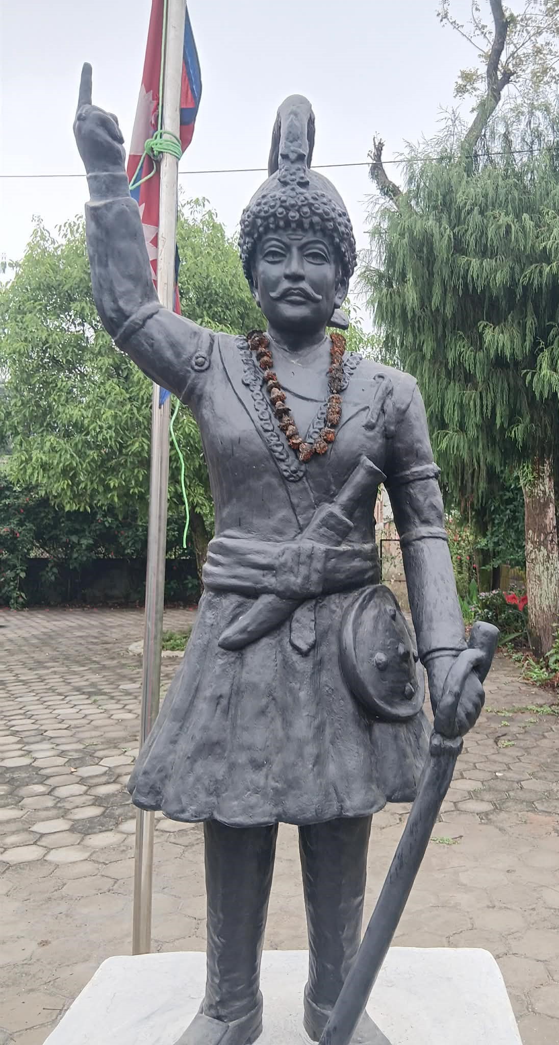 सांढे पांच फिट अग्लो पृथ्वीनारायण शाहको पुर्णकदको शालिक समाजसेवी तथा शिक्षाप्रेमी बाबुराम शर्माअधिकारीले एकता र सद्भावको सन्देशस्वरुप सिमेण्टमार्फत आफ्नै घरको आंगनमा निर्माण गरेका हुन् । वृद्ध अधिकारीले पृथ्वीनारायण शाहले नुवाकोटवाटै नेपालको एकिकरण सुरु गरेको, नुवाकोट टाकुरोमा साततले दरवार बनाएको उनले वेलकोट हुदै काठमाडौ उपत्यकासहित धेरै टुक्रामा रहेको नेपाललाई एकै मालामा उनेको जनाउंदै आफ्नै घरमा शालिक निर्माण गरेको बताए ।