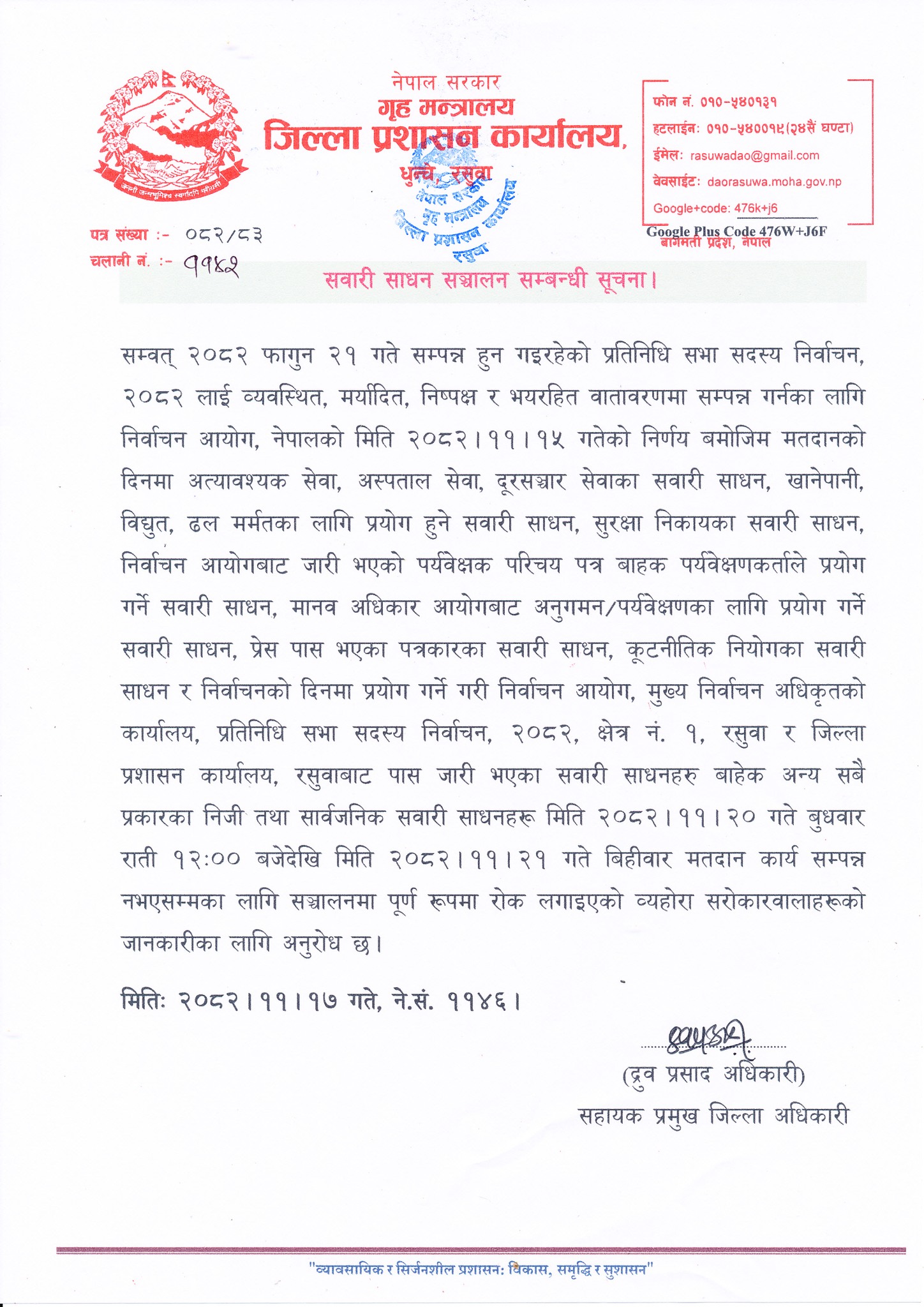 निर्वाचनलाई स्वच्छ, निष्पक्ष तथा शान्तिपूर्ण वातावरणमा सम्पन्न गर्ने उद्देश्यले नेपाल–चीन सीमा क्षेत्रको रसुवागढी नाका चार दिनका लागि बन्द गरिएको रसुवा प्रशासनले निकालेको सूचनामा उल्लेख छ । नुवाकोटसंगै जोेडिएको रसुवामा फागुन २० गते वुधवार राती १२ वजेदेखि २१ ग्ते विहीवार वेलुकी मतदान कार्य नसकिएसम्मका लागि सम्पुर्ण यातायातका साधन वन्द गरिएको रसुवा प्रशासनले जनाएको छ । निर्दिष्ट गरिएका र पास भएका यातायात मात्र सन्चालन हुन पाउने जनाइएको छ ।