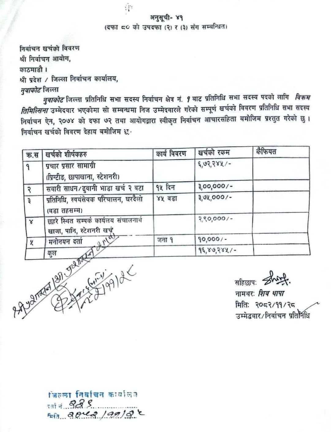 उक्त खर्च विवरण प्रतिनिधिसभा सदस्य निर्वाचन ऐन, २०७४ तथा निर्वाचन आयोगले स्वीकृत गरेको आचारसंहिताअनुसार जिल्ला निर्वाचन कार्यालय नुवाकोट, प्रदेश निर्वाचन कार्यालय र निर्वाचन आयोगमा पेश गरिएको छ । निर्वाचन ऐनअनुसार उम्मेदवारहरूले निर्वाचन सम्पन्न भएपछि आफ्नो चुनावी खर्च विवरण आयोगमा बुझाउनुपर्ने व्यवस्था रहेको छ ।