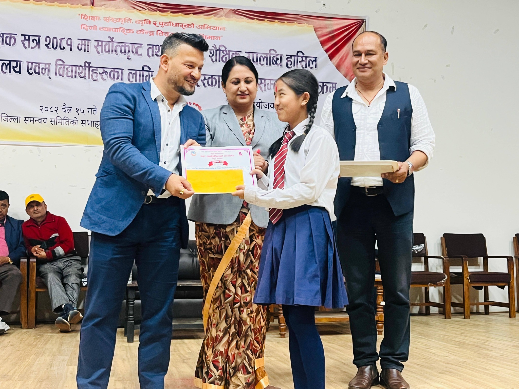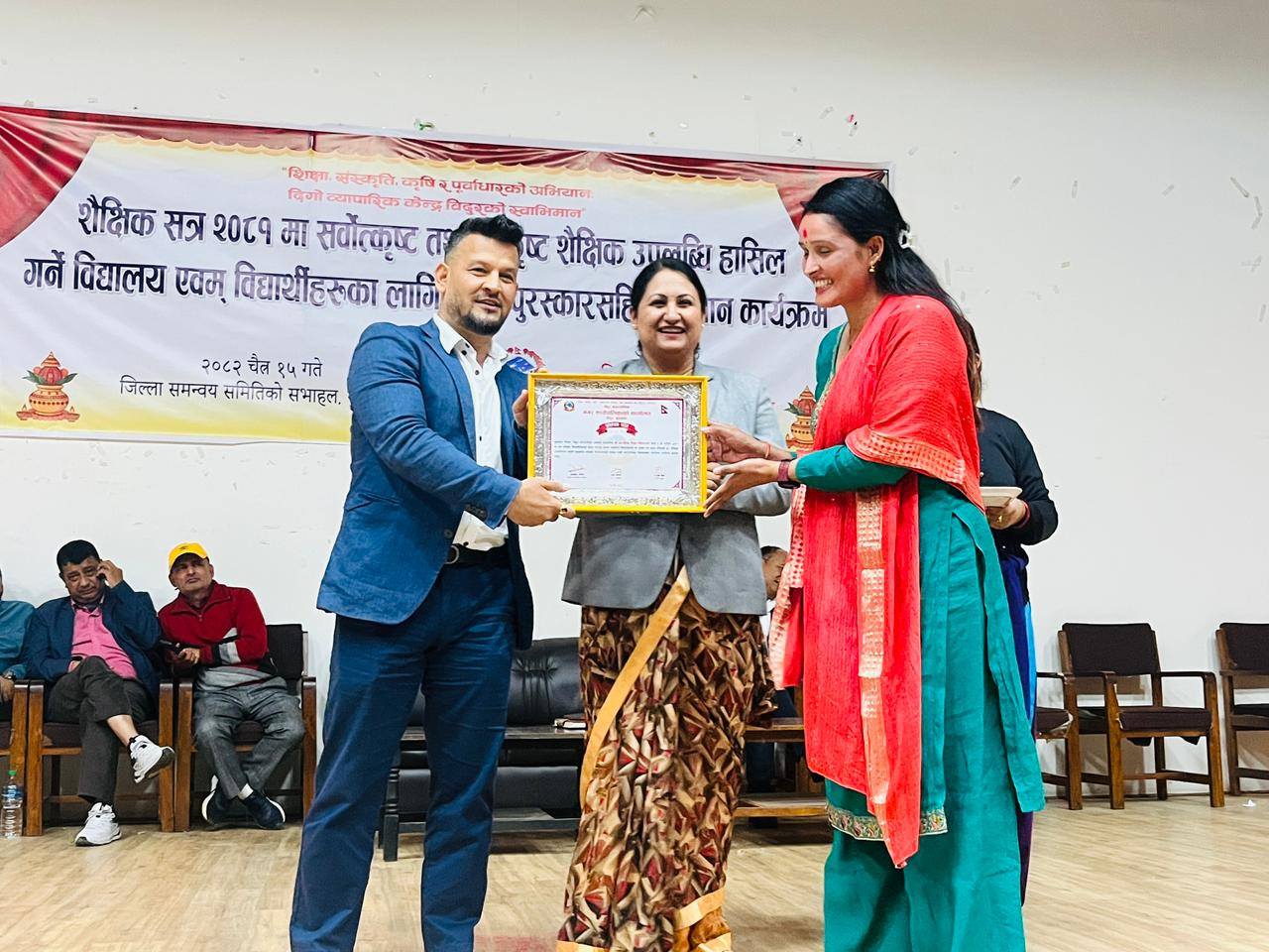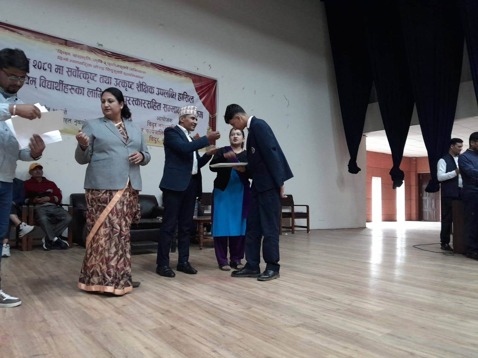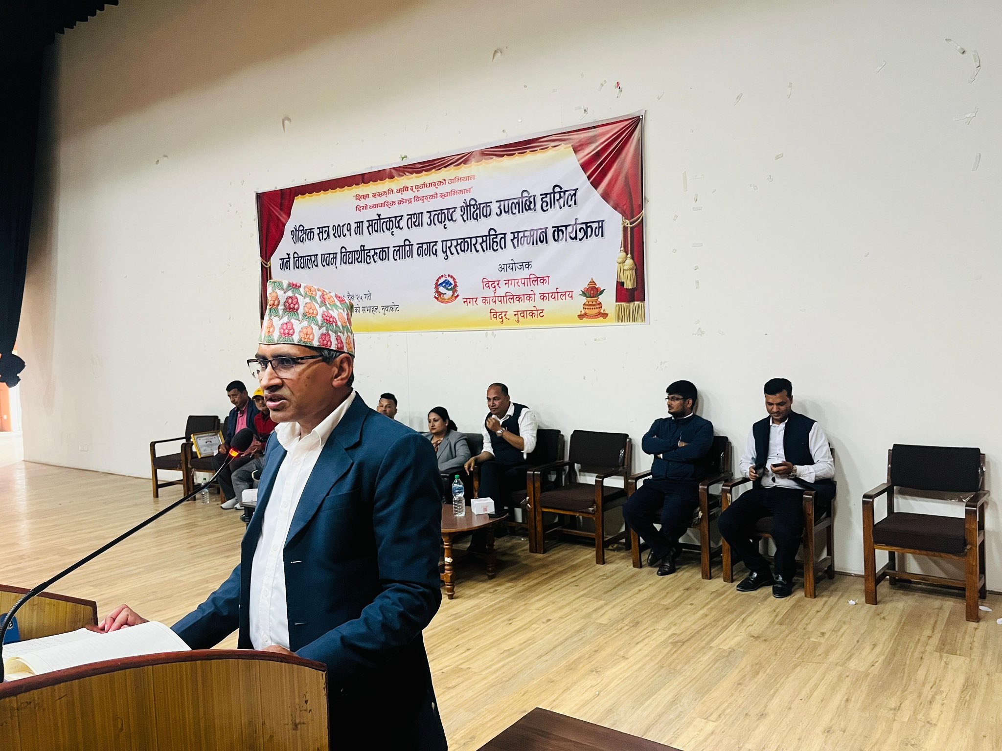 वितेको शैक्षिक शत्रमा उत्कृष्ट शैक्षिक उपलब्धि हासिल गरेका ३७ विद्यालय, कक्षा १२, एसइइ, कक्षा ८ र कक्षा ५ को परीक्षामा चार जिपिए प्राप्त गर्ने ७ जना सहित ३ दशमलव ८० वा सो भन्दा माथि जिपिए प्राप्त गरेका दुईसय १ जना विद्यार्थीलाई नगद पुरस्कारका साथ सम्मान गरिएको हो । विदुर नपाले गत शैक्षिक सत्र २०८१ मा सर्वोत्कृष्ट तथा उत्कृष्ट नतिजा हासिल गर्ने विद्यालय तथा विद्यार्थीहरूलाई सम्मान एवं पुरस्कार वितरण गरेको हो ।
