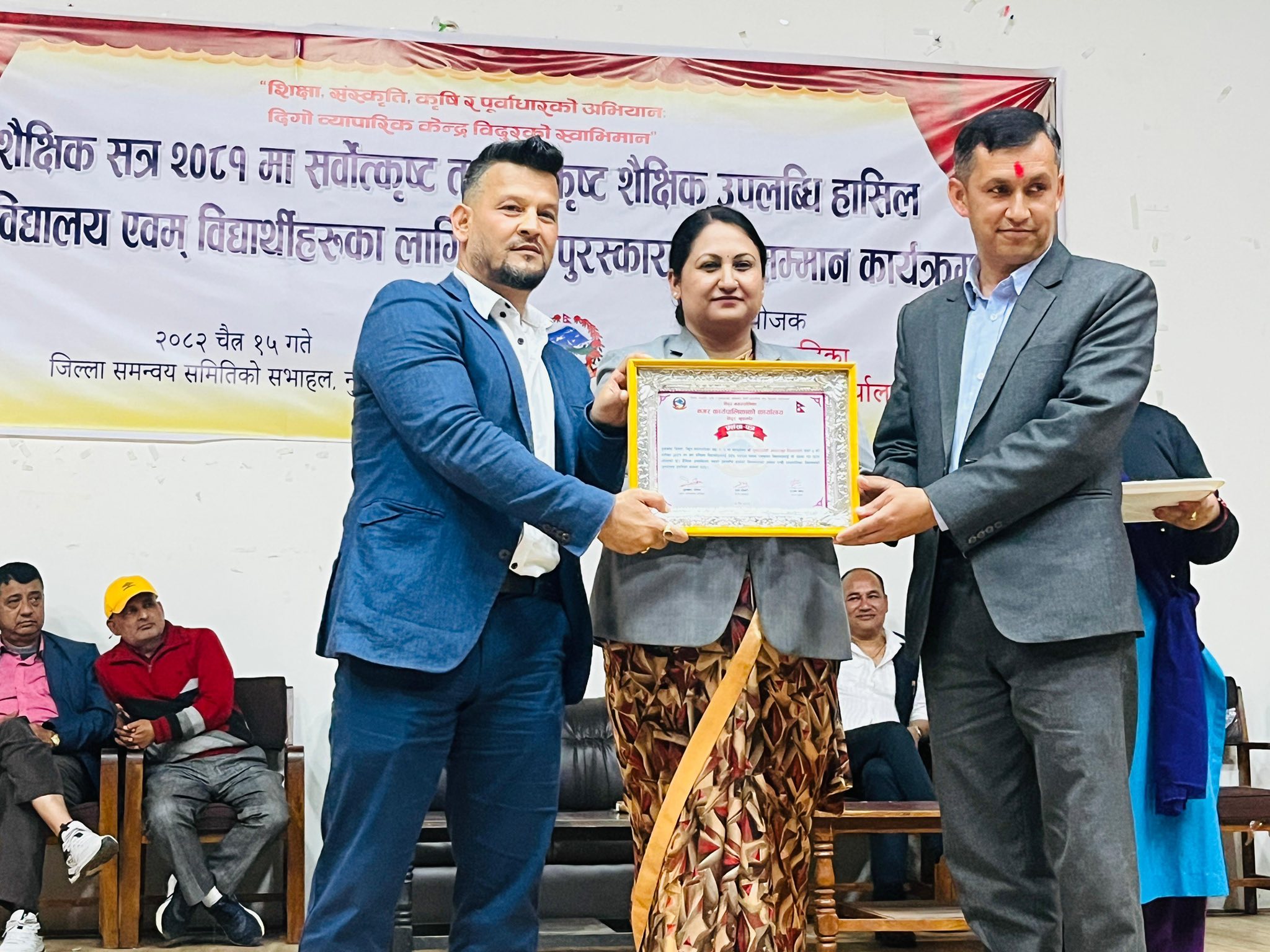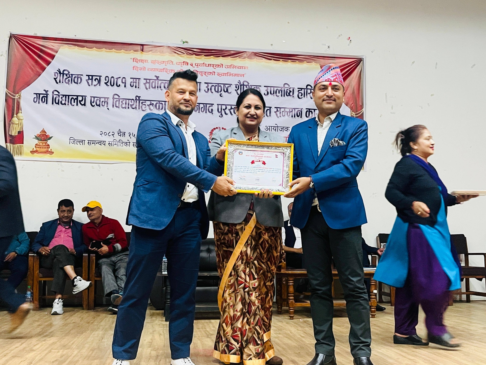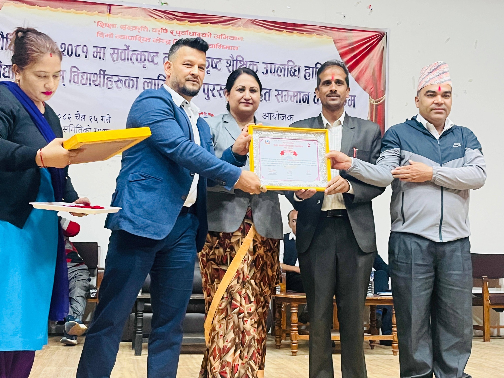 वितेको शैक्षिक शत्रमा उत्कृष्ट शैक्षिक उपलब्धि हासिल गरेका ३७ विद्यालय, कक्षा १२, एसइइ, कक्षा ८ र कक्षा ५ को परीक्षामा चार जिपिए प्राप्त गर्ने ७ जना सहित ३ दशमलव ८० वा सो भन्दा माथि जिपिए प्राप्त गरेका दुईसय १ जना विद्यार्थीलाई नगद पुरस्कारका साथ सम्मान गरिएको हो । विदुर नपाले गत शैक्षिक सत्र २०८१ मा सर्वोत्कृष्ट तथा उत्कृष्ट नतिजा हासिल गर्ने विद्यालय तथा विद्यार्थीहरूलाई सम्मान एवं पुरस्कार वितरण गरेको हो ।