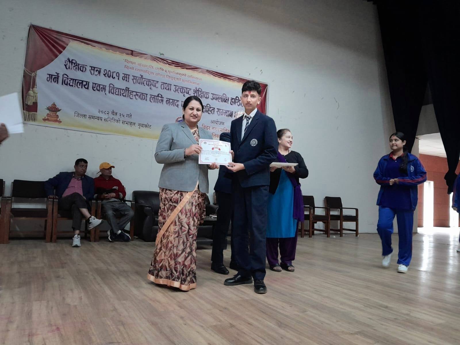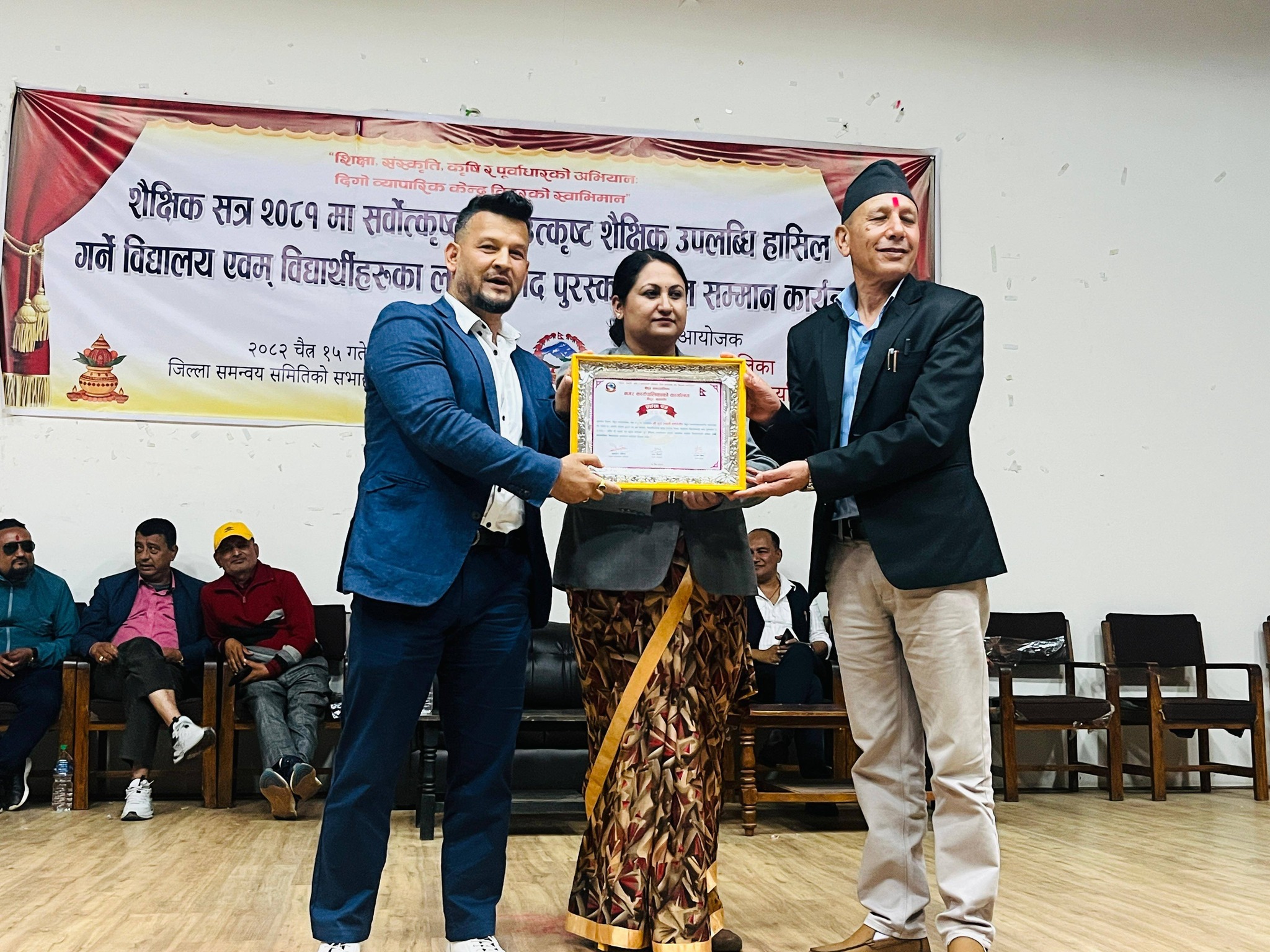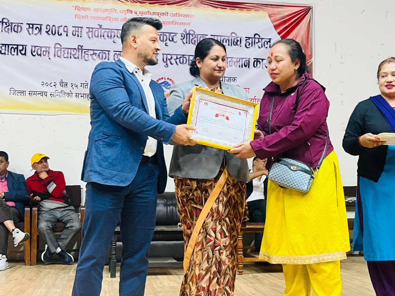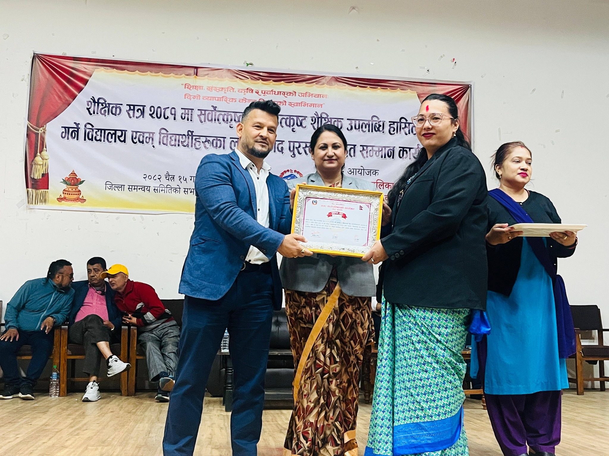 वितेको शैक्षिक शत्रमा उत्कृष्ट शैक्षिक उपलब्धि हासिल गरेका ३७ विद्यालय, कक्षा १२, एसइइ, कक्षा ८ र कक्षा ५ को परीक्षामा चार जिपिए प्राप्त गर्ने ७ जना सहित ३ दशमलव ८० वा सो भन्दा माथि जिपिए प्राप्त गरेका दुईसय १ जना विद्यार्थीलाई नगद पुरस्कारका साथ सम्मान गरिएको हो । विदुर नपाले गत शैक्षिक सत्र २०८१ मा सर्वोत्कृष्ट तथा उत्कृष्ट नतिजा हासिल गर्ने विद्यालय तथा विद्यार्थीहरूलाई सम्मान एवं पुरस्कार वितरण गरेको हो ।