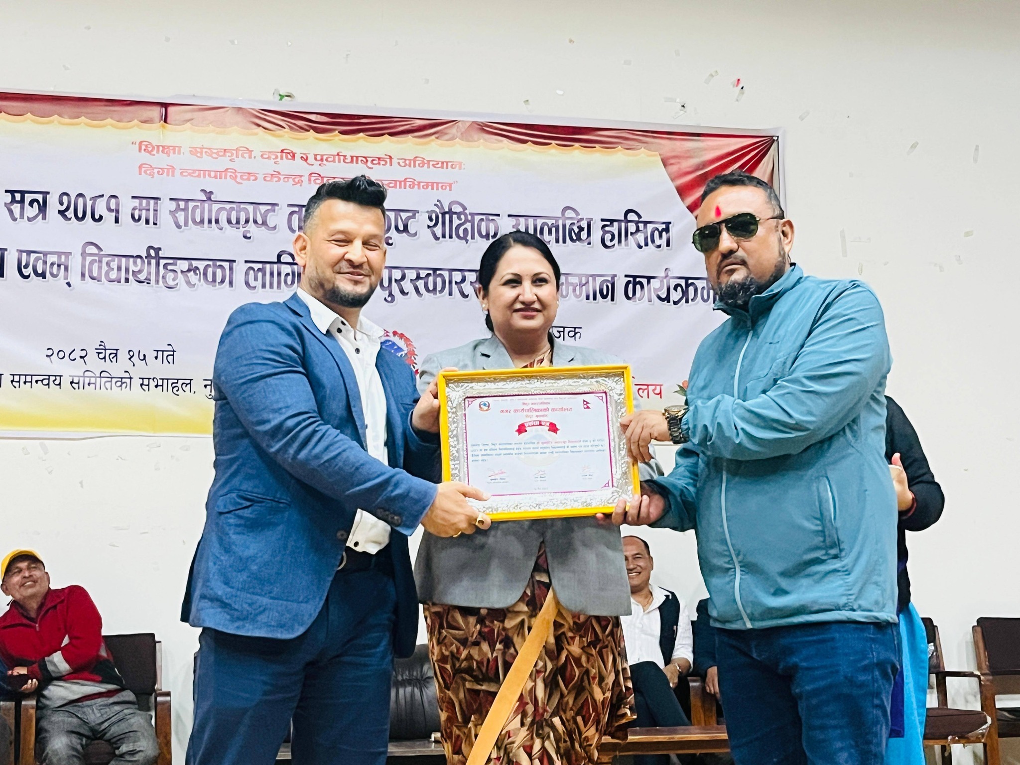 बिदुर – विद्यार्थीहरुलाई अध्ययनमा प्रोत्साहन गर्ने उद्धेश्यले नुवाकोटको विदुर नगरपालिकाले विद्यार्थीहरुलाई पुरस्कारसहित सम्मानित गरेको छ । शैक्षिक सत्र २०८१ मा सर्वोत्कृष्ट तथा उत्कृष्ट शैक्षिक उपलब्धि हासिल गरेका विद्यालय तथा विद्यार्थीहरुलाई एकैपटक नगद पुरस्कार सहित सम्मान गरिएको हो ।