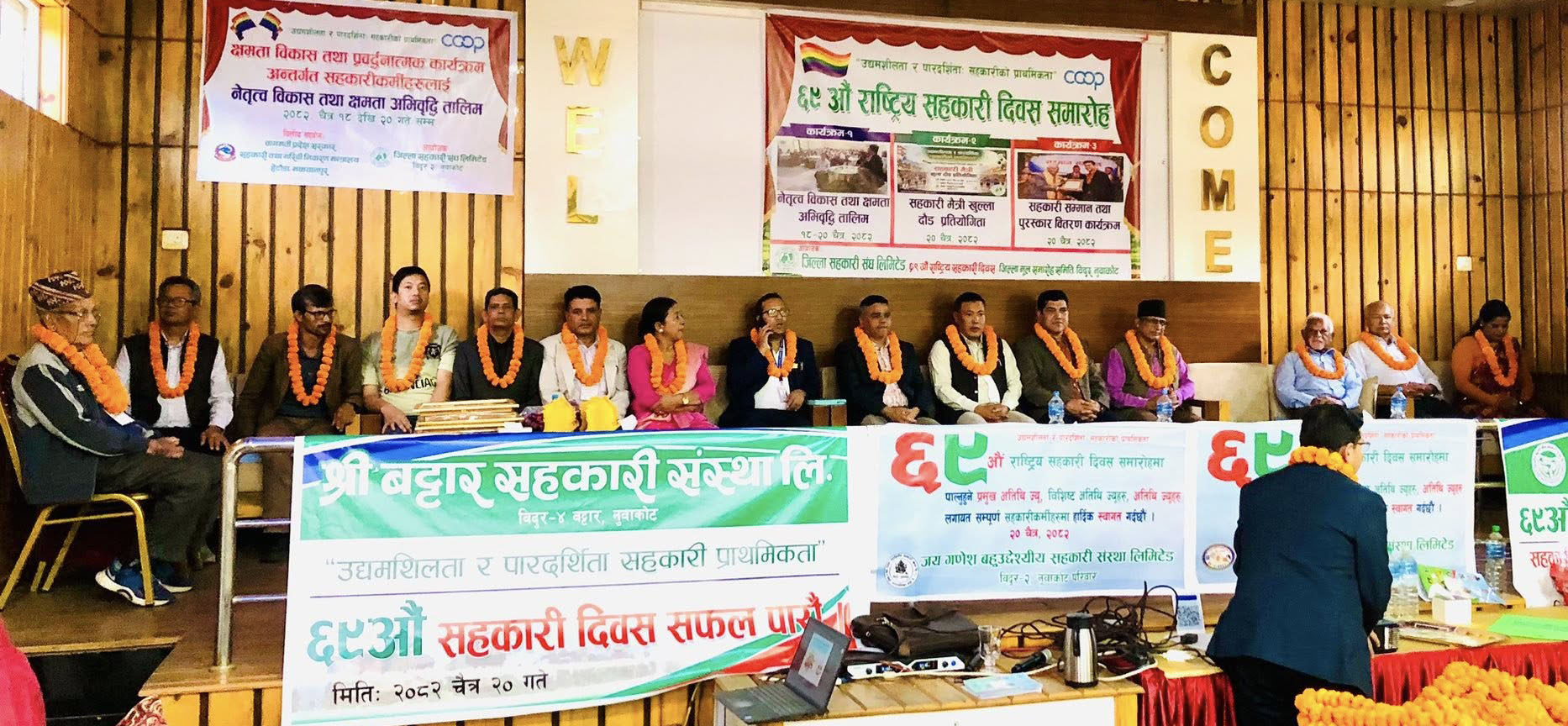 जिल्ला सहकारी संघ नुवाकोटको आयोजना तथा बाग्मती प्रदेश सहकारी तथा गरिबी निवारण मन्त्रालयको आर्थिक सहयोगमा ६९ औं राष्ट्रिय सहकारी दिवस बिभिन्न कार्यक्रमहरु गरी सम्पन्न भएको हो । उक्त अबसरमा नुवाकोट ५४ वटा सहकारी संस्थाहरुलाई नेतृत्व विकास तथा क्षमता अभिवृद्धि तालिम ,खुल्ला दौड प्रतियोगिता साथै उत्कृष्ट सहकारी संस्था, सचालक साथै कर्मचारी लाई सम्मान प्रदान गरिएको हो ।