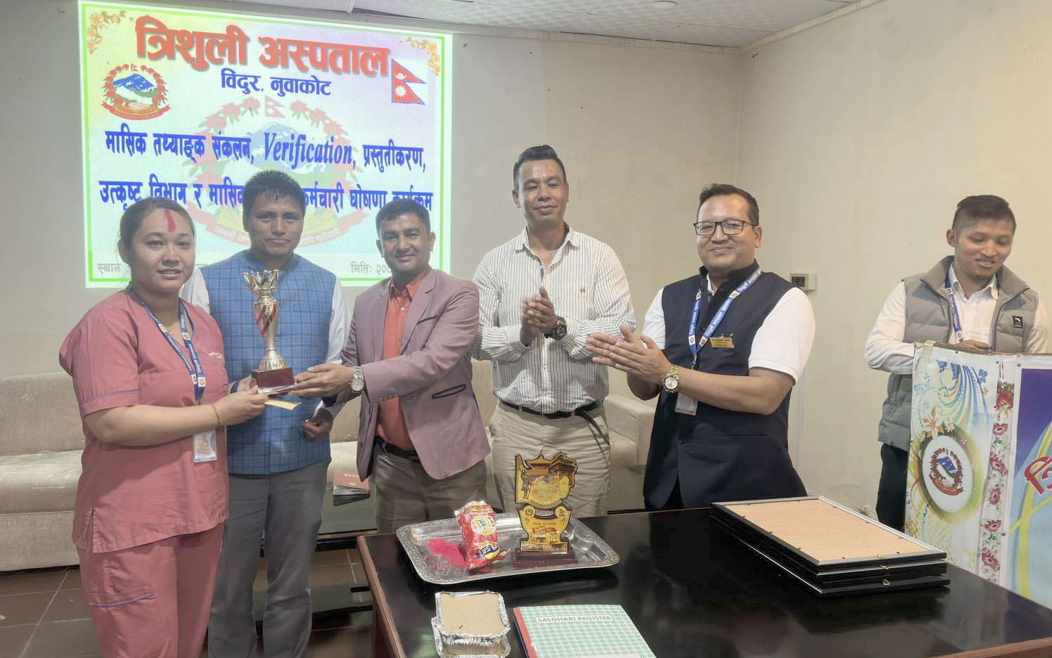 बिदुर – ६ दशक पुरानो नुवाकोटको त्रिशूली अस्पताल उत्कृष्ट कर्मचारी तथा विभागलाई पुरस्कृत गरेको छ । कार्यसम्पादनका आधारमा अस्पतालका कर्मचारी तथा विभागलाई नगदसहित पुरस्कृत गरिएको हो । अस्पतालमा आयोजित मासिक तथ्याङ्क सङ्कलन भेरिफिकेसन, प्रस्तुतीकरण तथा मासिक उत्कृष्ट विभाग एवं कर्मचारी घोषणा र पुरस्कृत कार्यक्रममा बिभिन्न आधार तथा सूचकहरुमा छनौट गरि पांच जना कर्मचारी र एक विभागलाई पुरस्कृत गरिएको हो ।