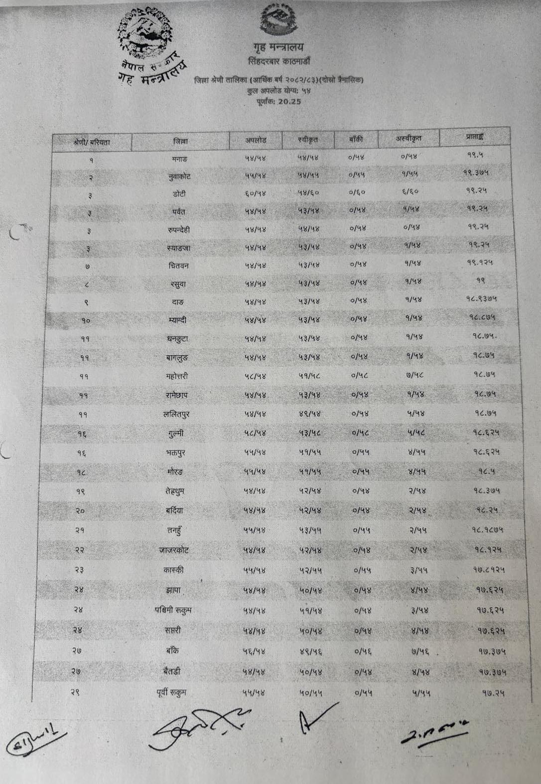 डोटी, पर्वत, रूपन्देही र स्याङ्जाले समान १९ दशमलव २५ अंक प्राप्त गरी तेस्रो स्थान हासिल गरेका छन् । मूल्यांकन प्रक्रियामा जिल्ला प्रशासन कार्यालयहरूले सम्पादन गरेका कार्यहरूको विवरण अनलाइन प्रणालीमार्फत अपलोड गर्नुपर्ने व्यवस्था छ । मन्त्रालयका अनुसार यो मूल्यांकनले जिल्लाहरूबीच विकास, सुशासन र सेवा प्रवाहमा स्वस्थ प्रतिस्पर्धाको वातावरण सिर्जना गरेको छ । नुवाकोटको छिमेकी जिल्ला रसुवा ८ औ स्थानमा परेको छ ।