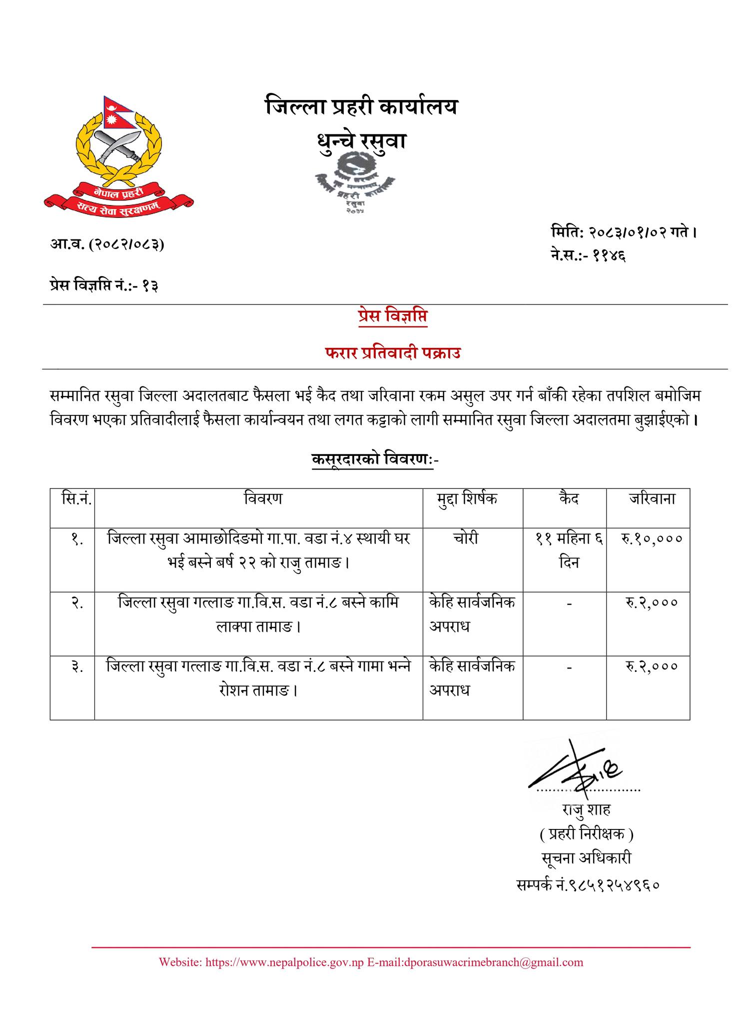 अदालतवाट चोरी मुद्धामा एक जना र केहि सार्वजनिक अपराध मुद्धामा दोषी ठहर भएका दुई जनासमेत तीन जना फरार रहेकोमा उनीहरुलाई पक्राउ गरि अदालतमा पेश गरिएको प्रहरी निरीक्षक राजु शाहले जानकारी दिए । उनका अनुसार चोरी मुद्धामा ११ महिना ६ दिन कैद र १० हजार रुपैया जरिवानाको फैसला भएका रसुवाको आमाछोदिङमो गापा ४ का २२ वर्षिय राजु तामाङ तथा केहि सार्वजनिक अपराध मुद्धामा जनही दुई÷दुई हजार रुपैया जरिवानाको फैसला भएका साविक गत्लाङ गाविस ८ का कामलिाक्पा तामाङ र सोही स्थानका रोशन तामाङलाई पक्राउ गरि फैसला कार्यान्वयन तथा लगत कट्टाका लागि रसुवा जिल्ला अदालतमा वुझाइएको प्रहरी निरीक्षक शाहले वताए ।