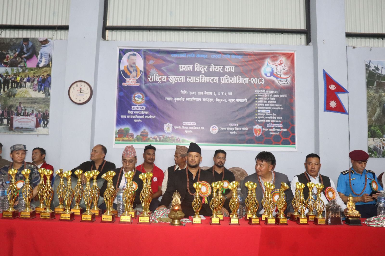 तीन दिनसम्म सन्चालन हुने प्रतियो्गितामा विभिन्न नौ वटा विद्यामा विजेता, उपविजेता तथा तृतीयले नगद पुरस्कार थाप्नेछन् । बिदुर नपा २ स्थित बट्टार ब्याडमिन्टन कभर्ड हलमा सन्चालित उक्त प्रतियोगितामा एकसय ९३ जना खेलाडिहरुले विभिन्न विद्यामा प्रतिस्पर्धा गरिरहेको व्यवस्थापक नुवाकोट ब्याडमिन्टन संघका अध्यक्ष धनसिंह तामाङले जानकारी दिए । उक्त प्रतियोगितामा महिला तथा पुरुषका छुट्टाछुट्टै खेल सन्चालन गरिएको छ ।