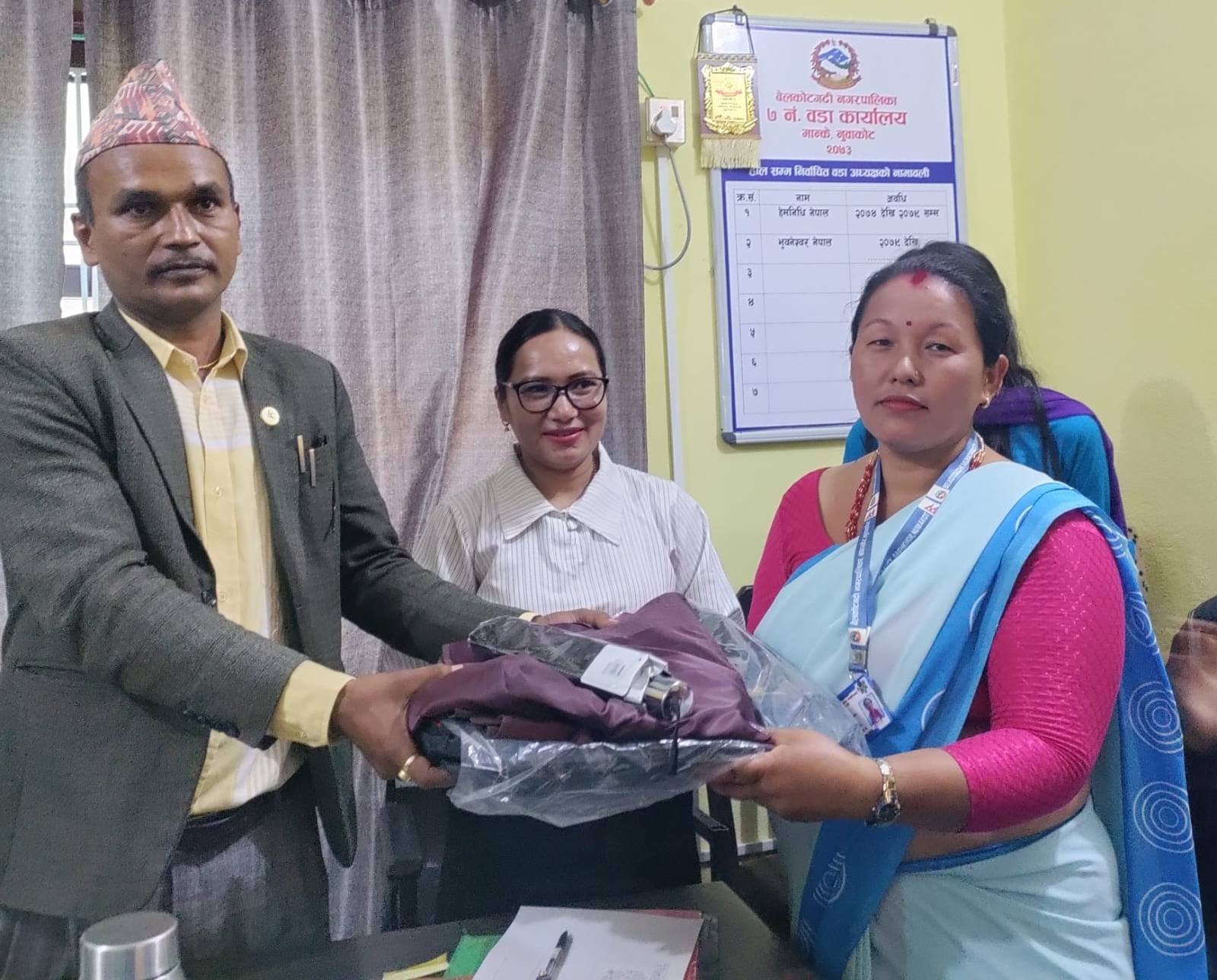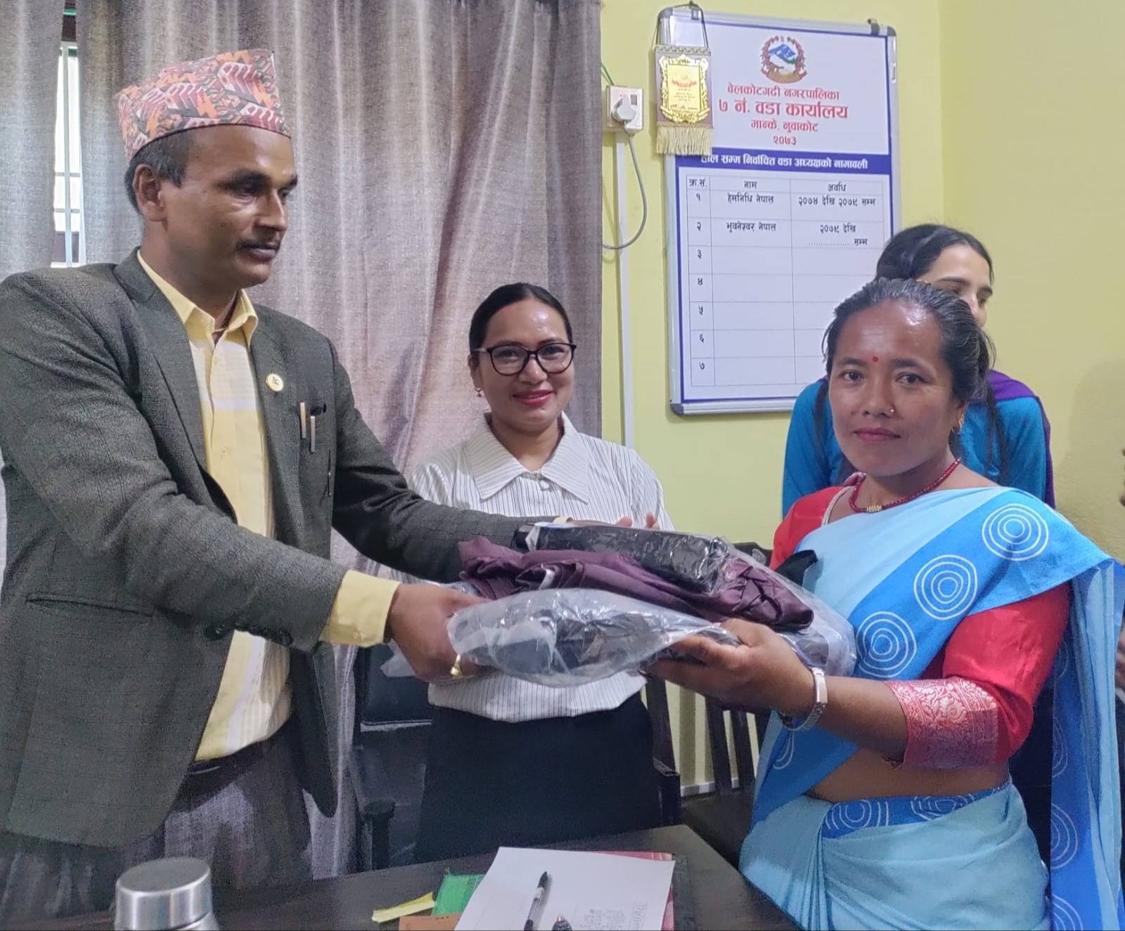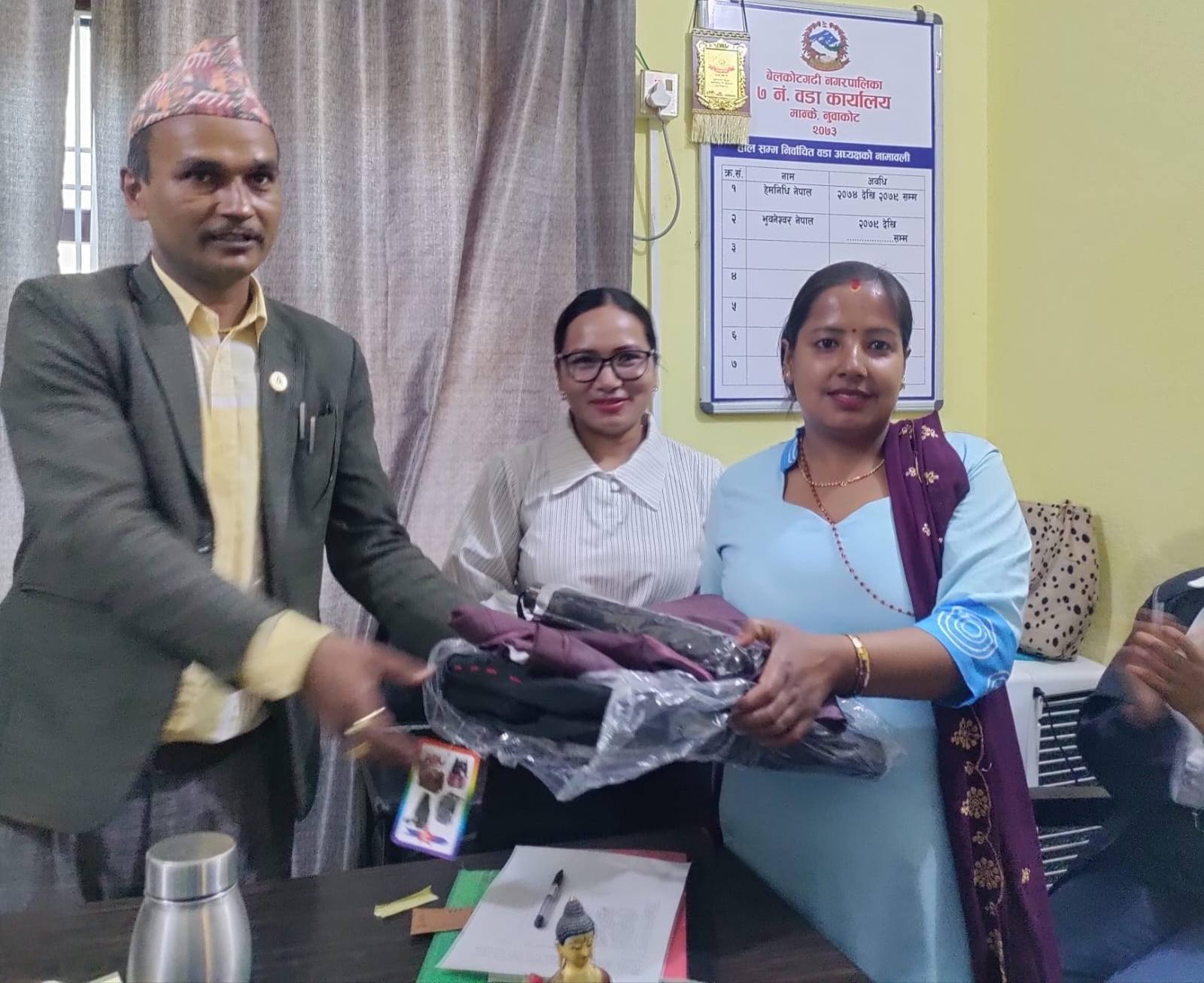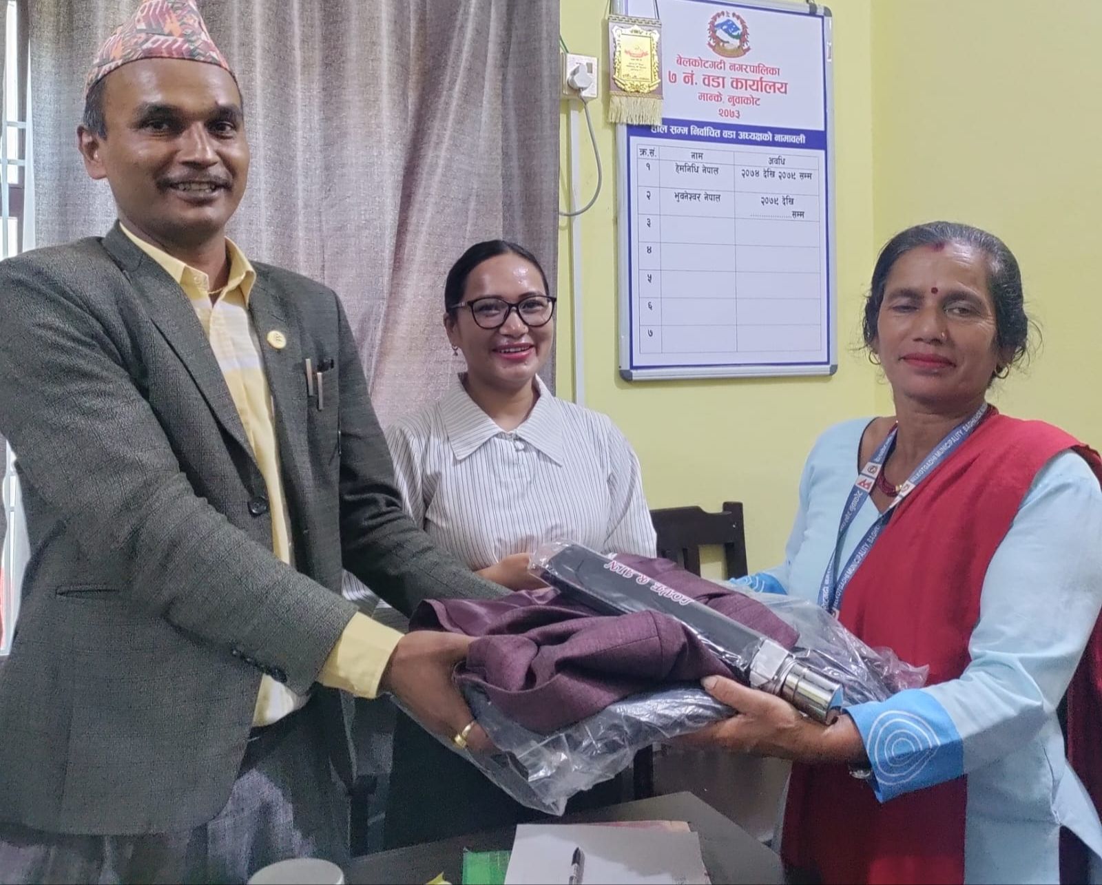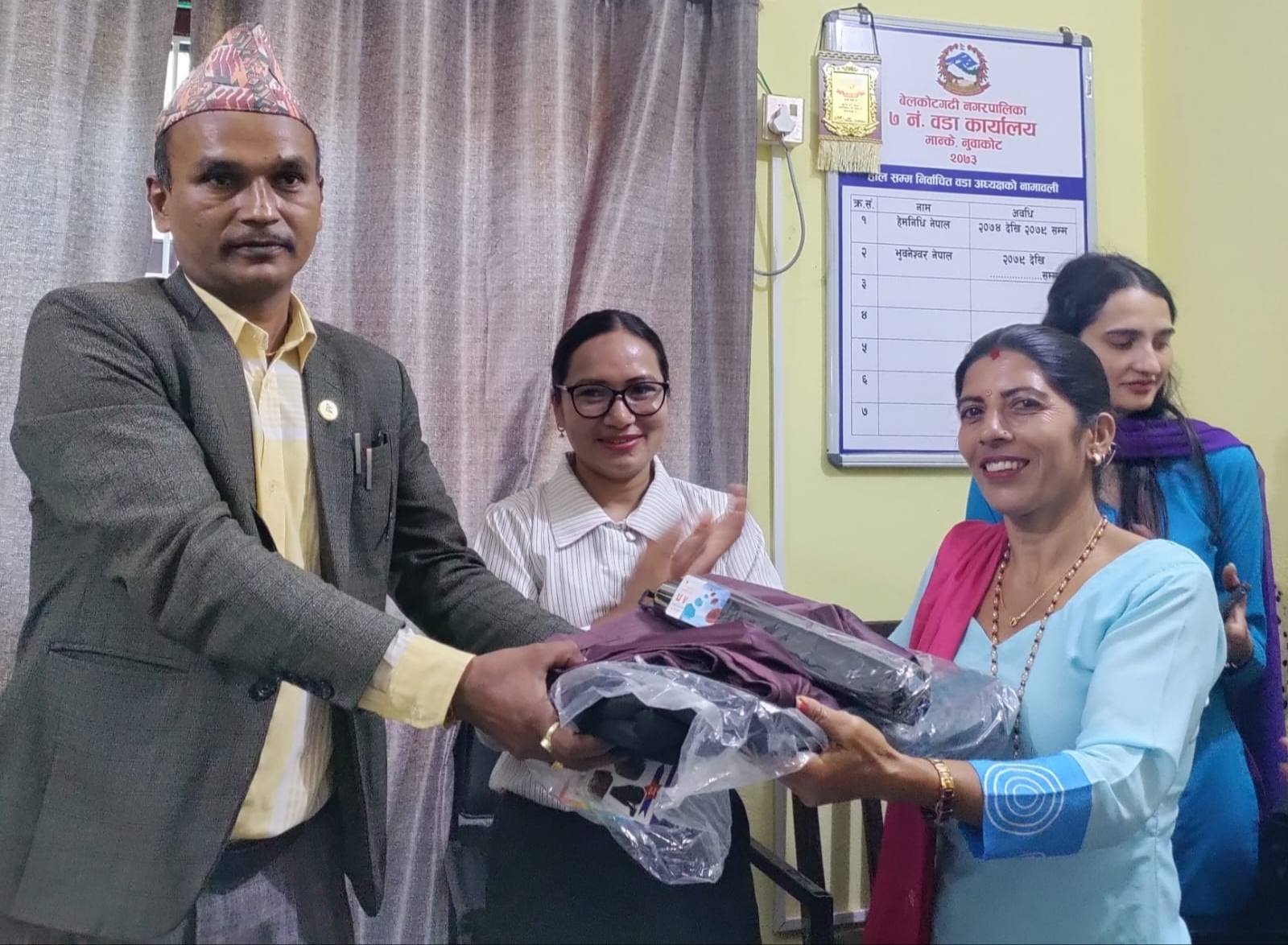 बेलकोटगढी नगरपालिका ७ द्वारा विनियोजित बजेटबाट वडामा कार्यरत महिला स्वास्थ्य स्वयम्सेविकाहरूलाई प्रोत्साहन स्वरूप विभिन्न सामग्री वितरण गरिएको हो । स्वास्थ्य स्वंसेविकाहरूको कार्य सम्पादनमा सहजता र सेवा प्रवाहमा क्रियाशीलताका लागि प्रतिव्यक्ति एक थान कोट, झोला र छाता प्रदान गरिएको हो ।