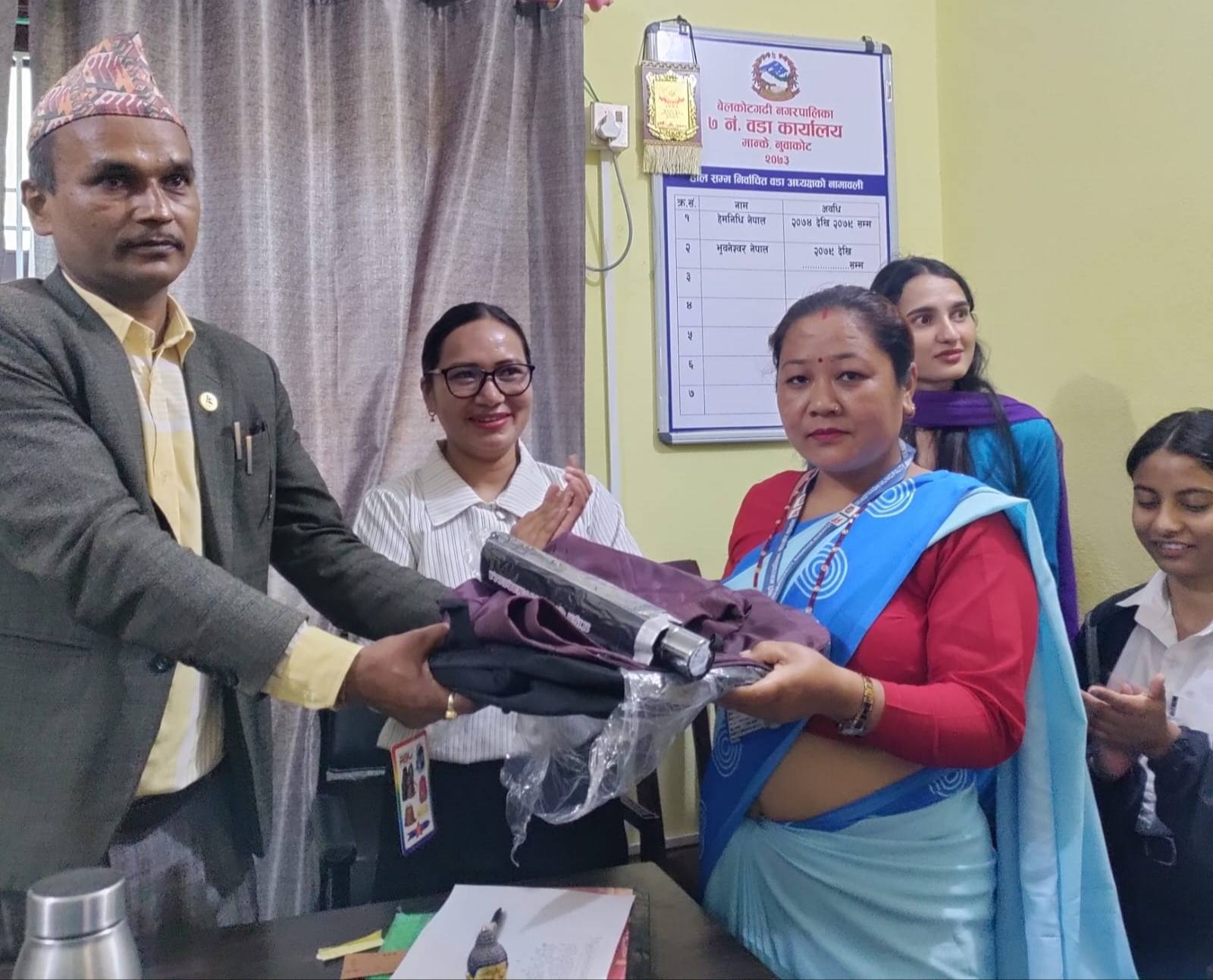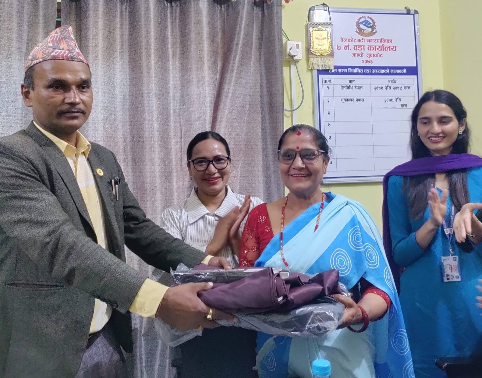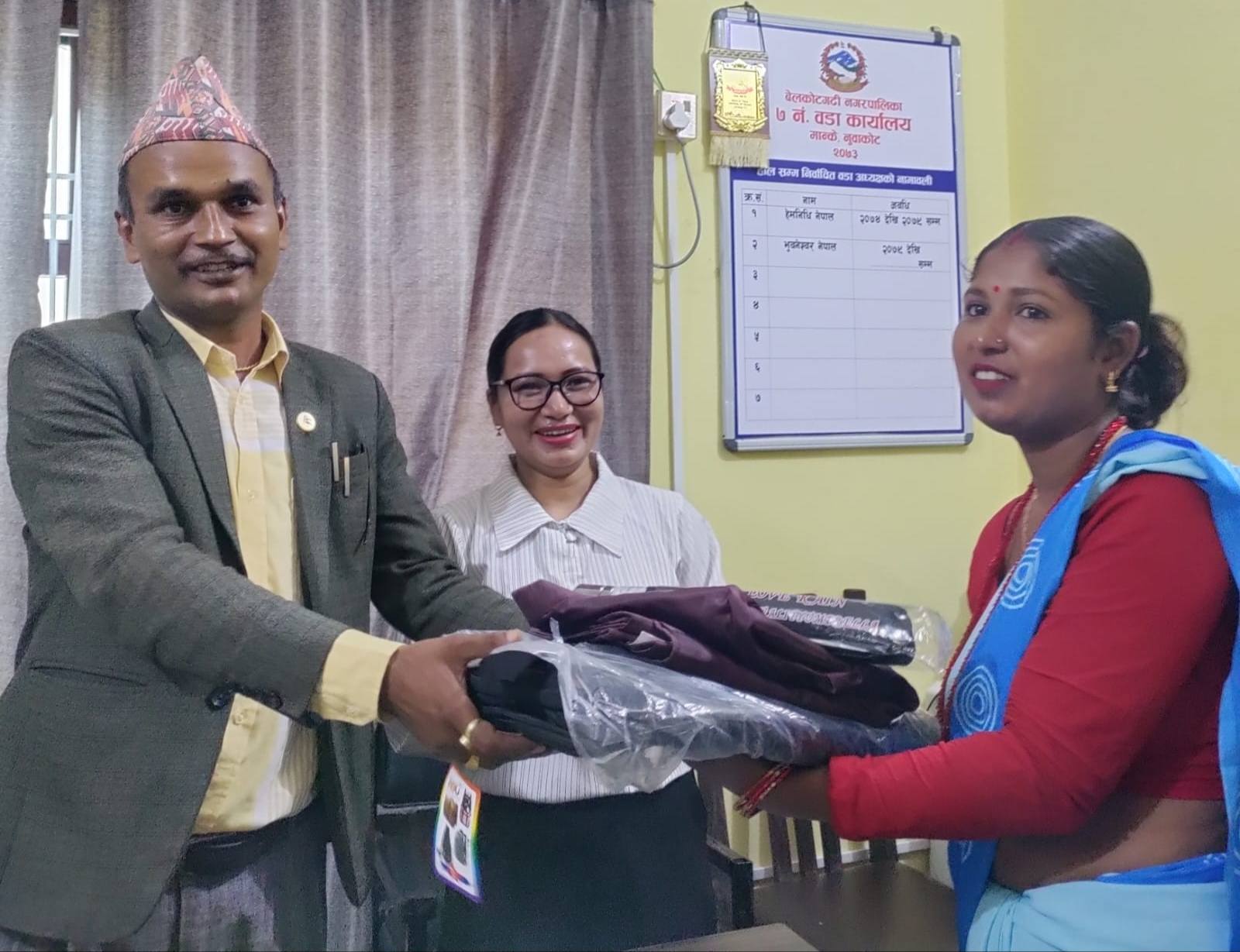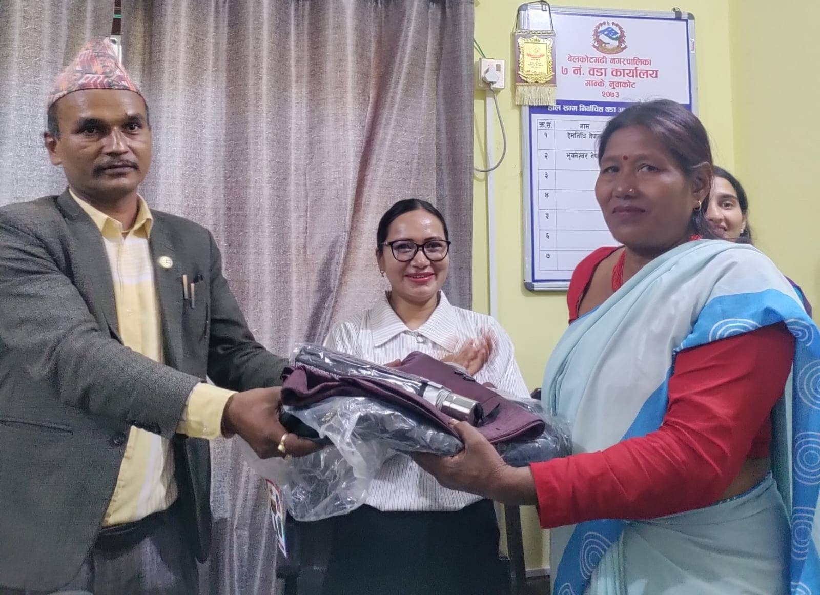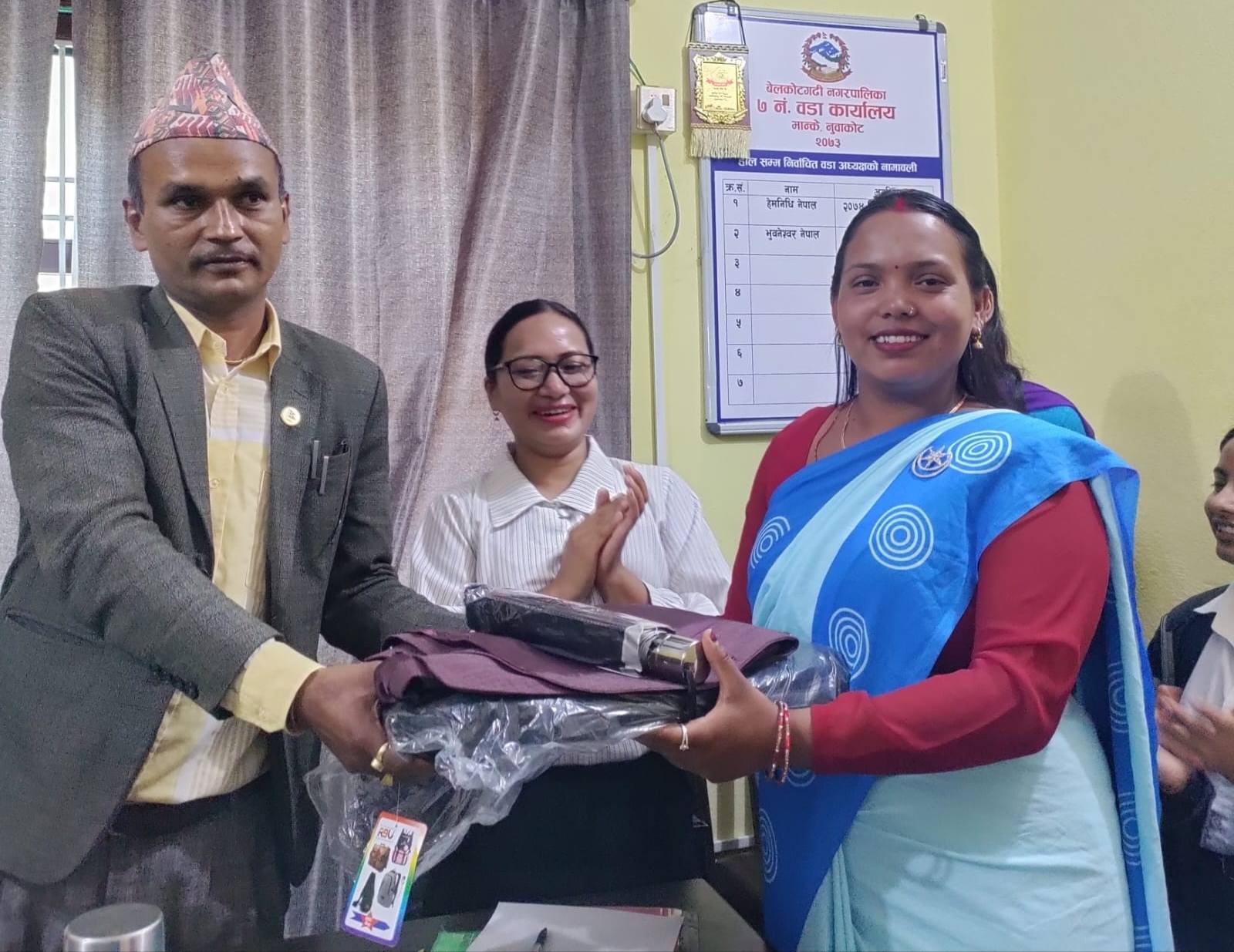 बेलकोटगढी नगरपालिका ७ द्वारा विनियोजित बजेटबाट वडामा कार्यरत महिला स्वास्थ्य स्वयम्सेविकाहरूलाई प्रोत्साहन स्वरूप विभिन्न सामग्री वितरण गरिएको हो । स्वास्थ्य स्वंसेविकाहरूको कार्य सम्पादनमा सहजता र सेवा प्रवाहमा क्रियाशीलताका लागि प्रतिव्यक्ति एक थान कोट, झोला र छाता प्रदान गरिएको हो ।